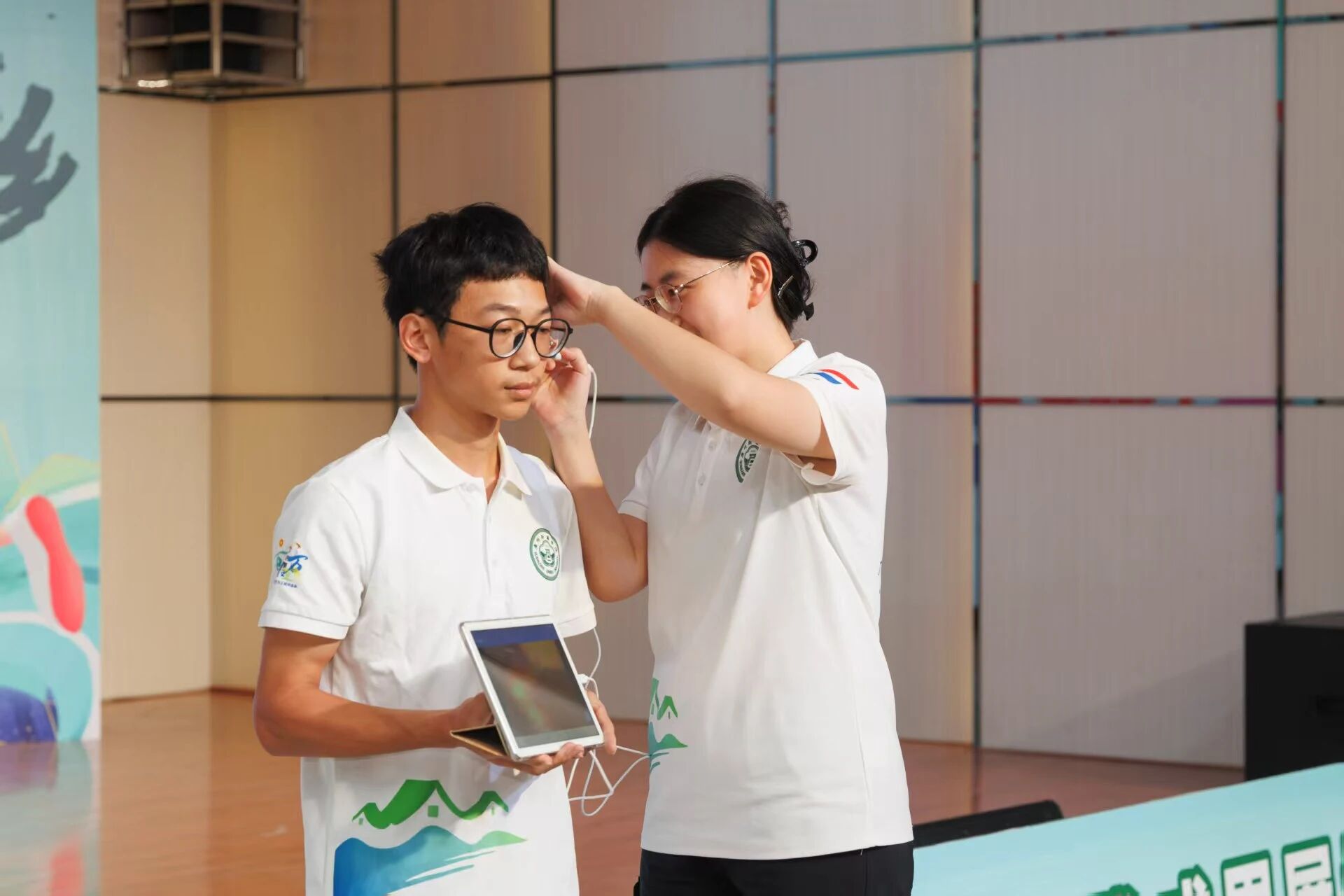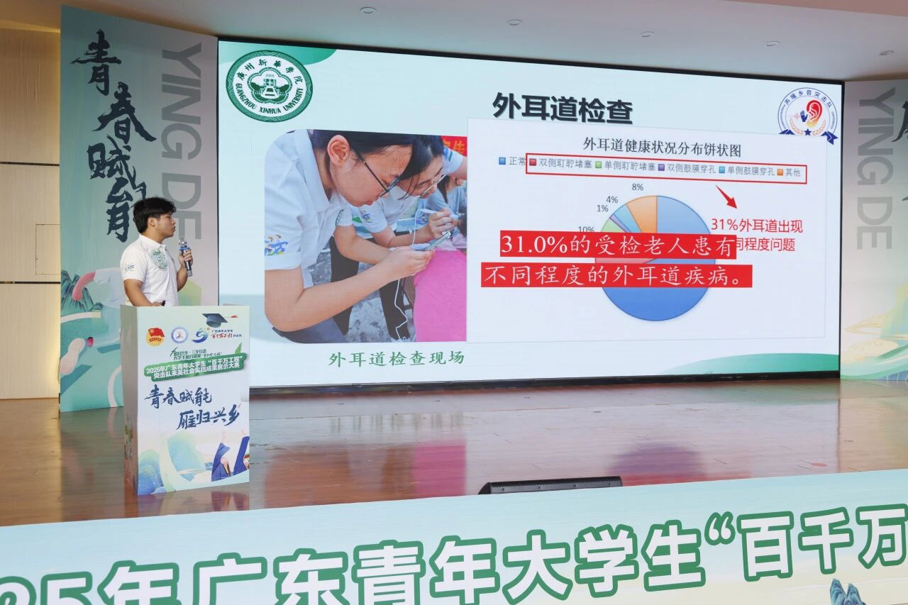 在决赛现场,队员们通过情景演示、实物操作等方式,生动展示了外耳道检查等专业服务内容。主讲人卓彦烨、刘嘉雯沉着自信,清晰传达团队的服务理念与社会价值,赢得评委与观众的一致好评。