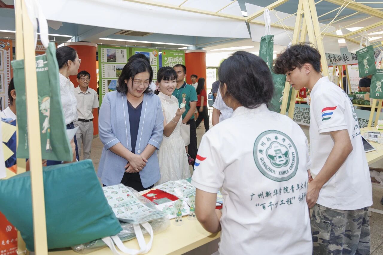 在决赛路演中,队员陈祺作为主讲人,生动阐述了团队的设计理念与实践成果。现场摊位展示环节,团队带来了丰富的文创实物,吸引了众多观众驻足观看,甚至英德市副市长也亲临摊位参观指导,对团队成果表示高度认可。