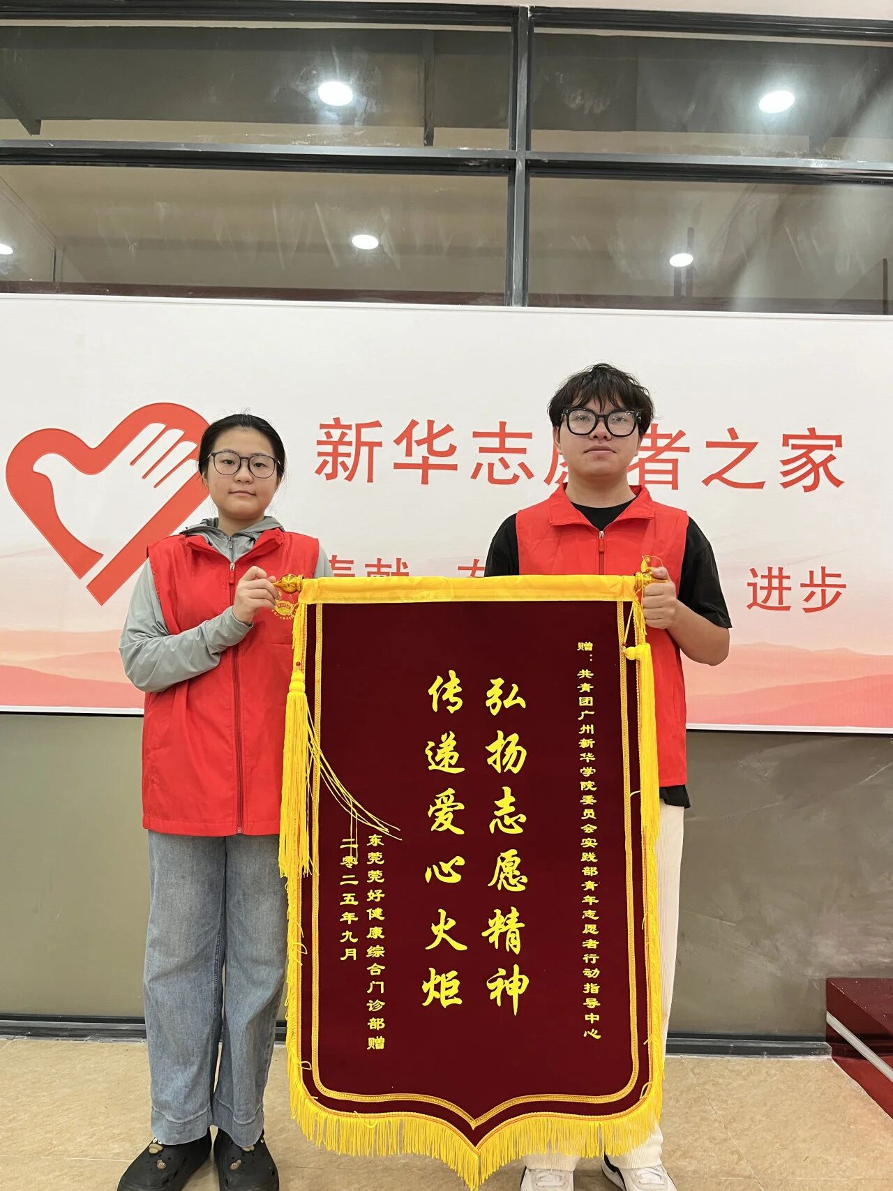 同时,东莞莞好健康综合门诊部于2025年9月向校青指赠予锦旗,锦旗上“弘扬志愿精神,传递爱心火炬”的赞誉,既是对校青指志愿者长期投身公益、热忱服务社会的高度肯定,也生动诠释了他们在各类志愿服务活动中,以专业素养和赤诚之心,为需要帮助的群体排忧解难、播撒善意的担当。他们用一次次暖心的行动,将志愿精神的火种不断传递,在校园与社会之间构建起爱心的纽带,为推动公益事业发展、营造团结互助的社会风尚贡献了青春力量。这面锦旗不仅是荣誉的见证,更是对他们持续践行“奉献、友爱、互助、进步”志愿精神的激励,鼓舞着更多青年加入到传递爱心、服务社会的行列中。