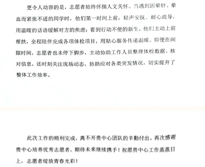 这封表扬信,不仅是对志愿者辛勤付出的最好肯定,更是对他们专业服务与责任担当的高度认可。字里行间,既生动诠释了“奉献、友爱、互助、进步”的志愿精神,也彰显了当代青年志愿者的公益热忱与使命担当。
