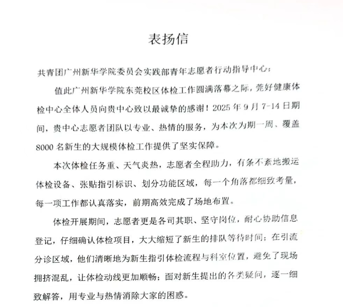 2025年9月14日,东莞莞好健康综合门诊部向校青指发来表扬信。在9月7日-14日广州新华学院(东莞校区)新生体检工作中,校青指志愿者团队在校团委的指导下为覆盖8000名新生的大规模体检提供坚实保障。
