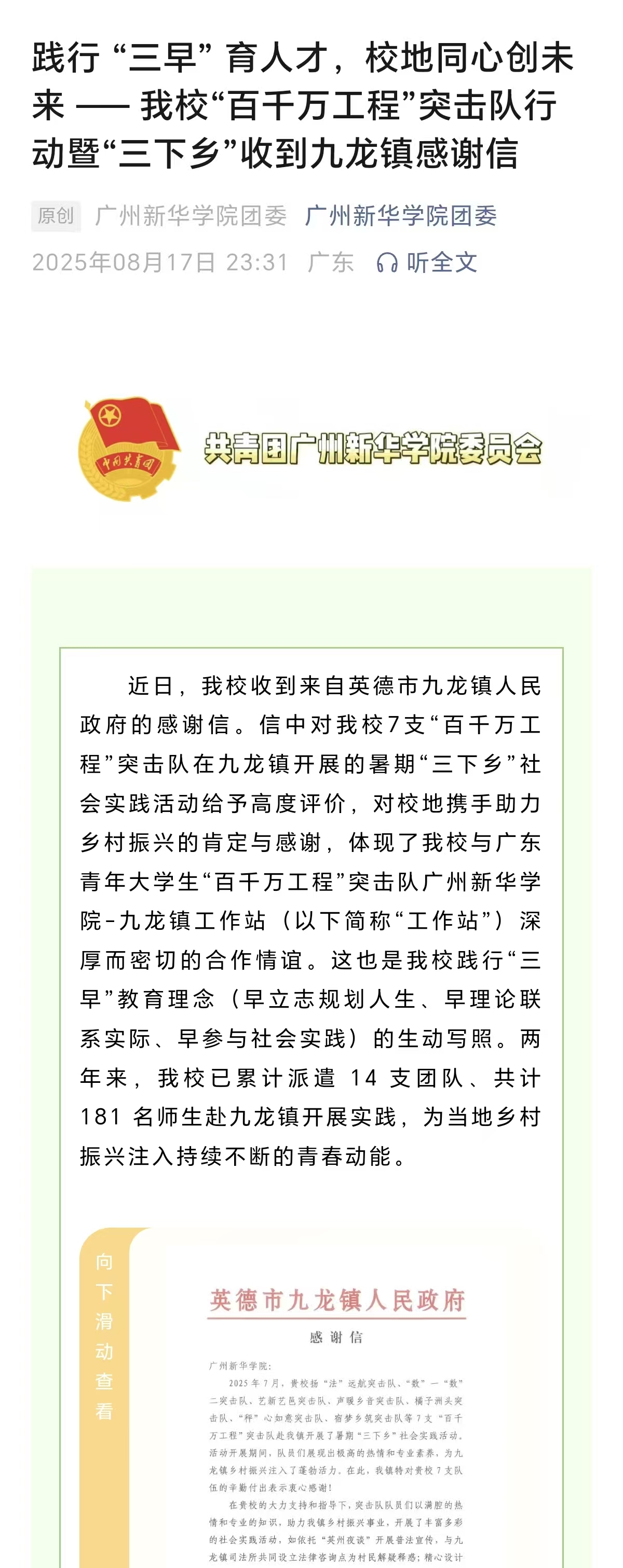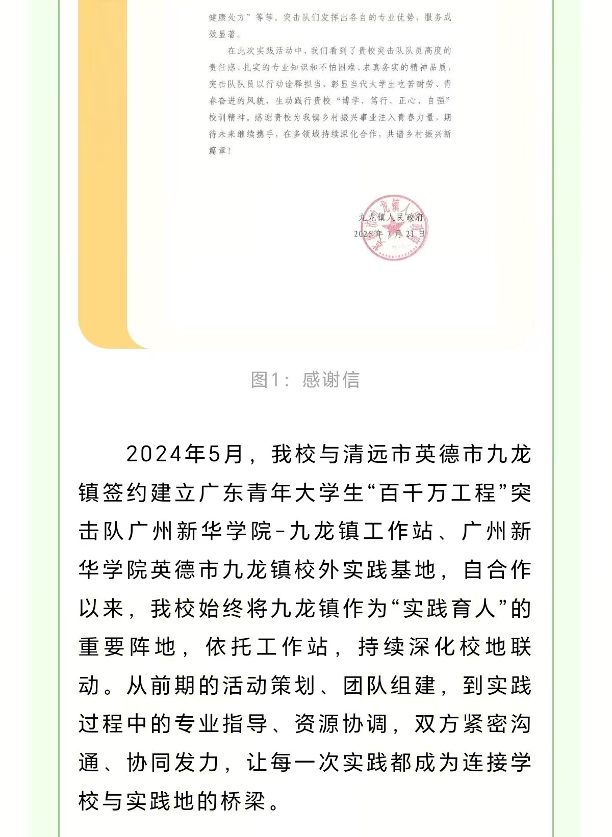 践行 “三早” 育人才,校地同心创未来 —— 我校“百千万工程”突击队行动暨“三下乡”收到九龙镇感谢信