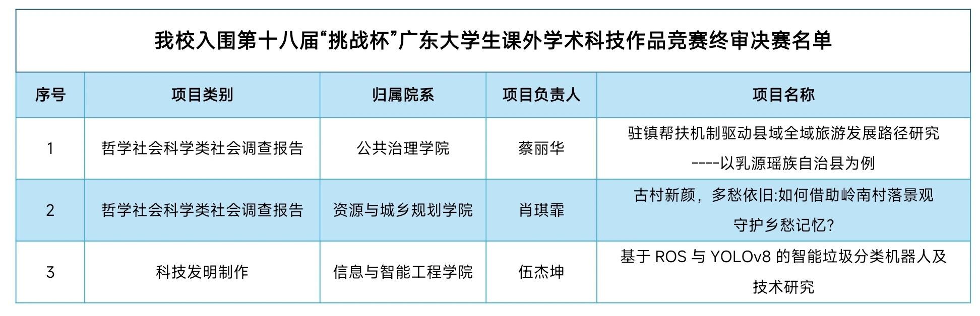 图2:我校入围第十八届“挑战杯”广东大学生课外学术科技作品竞赛终审决赛名单