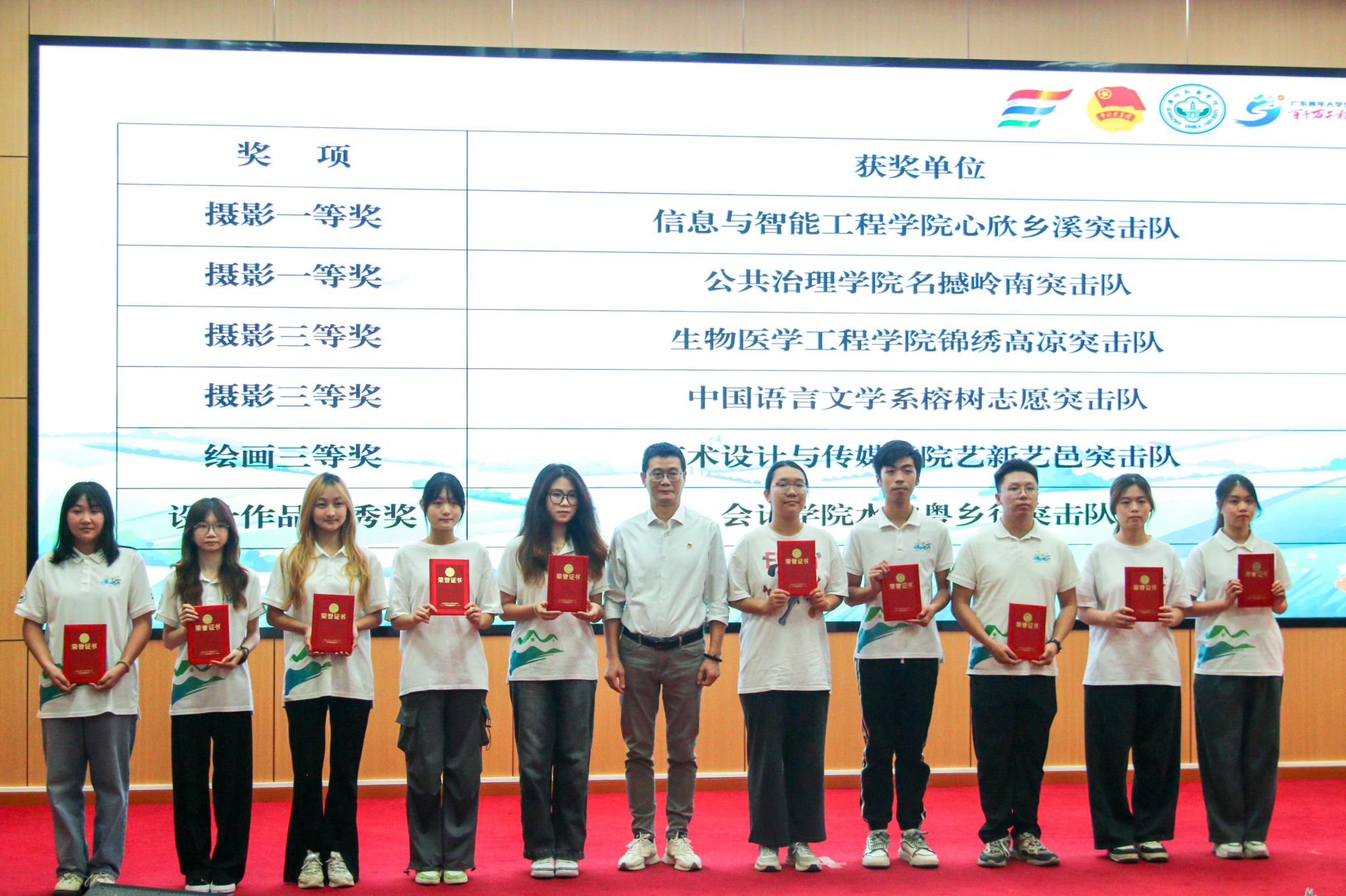 图13:学校校长助理、教务处处长蔡映辉(左五)为2024年“践行・光影”视频创作大赛和2024年“青春印记・乡村振兴”我与“三下乡”的故事分享会活动奖项获奖代表颁奖