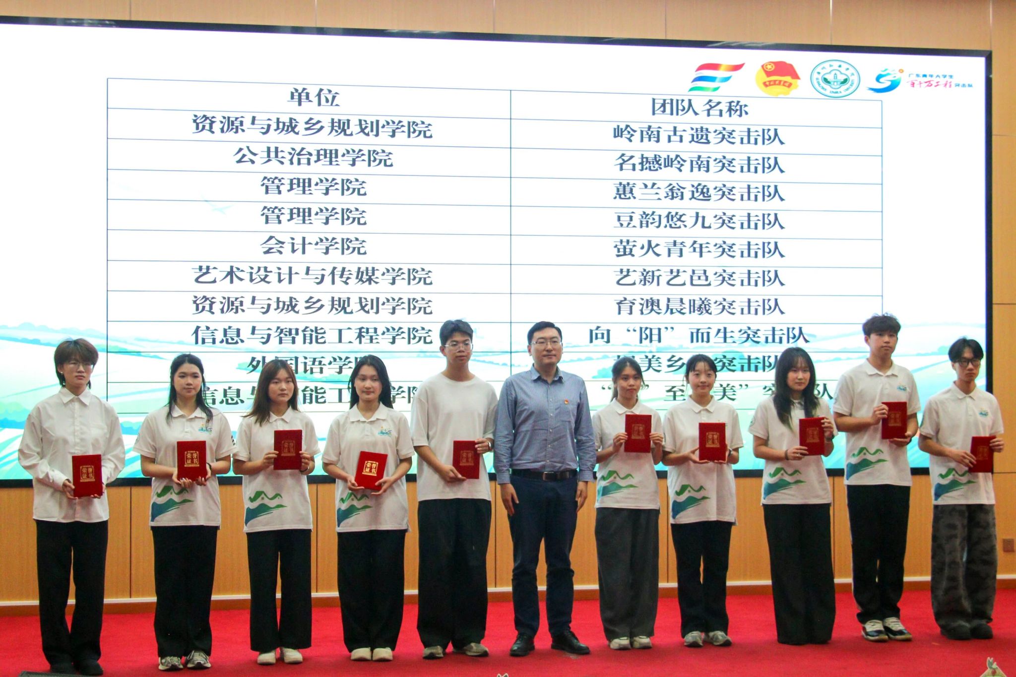 图11:学校党委学生工作部部长刘景毅(左六)为校级优秀团队奖获奖代表颁奖