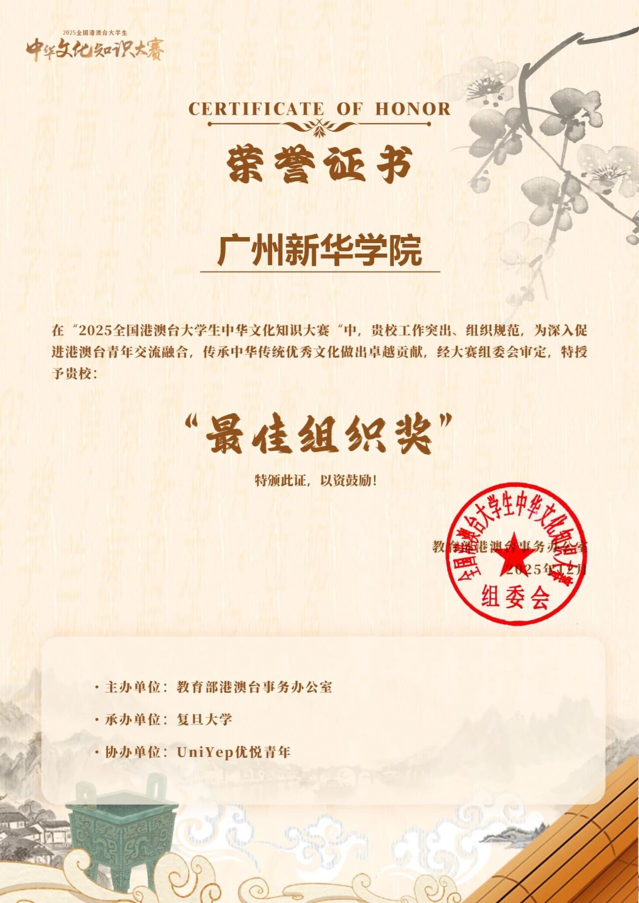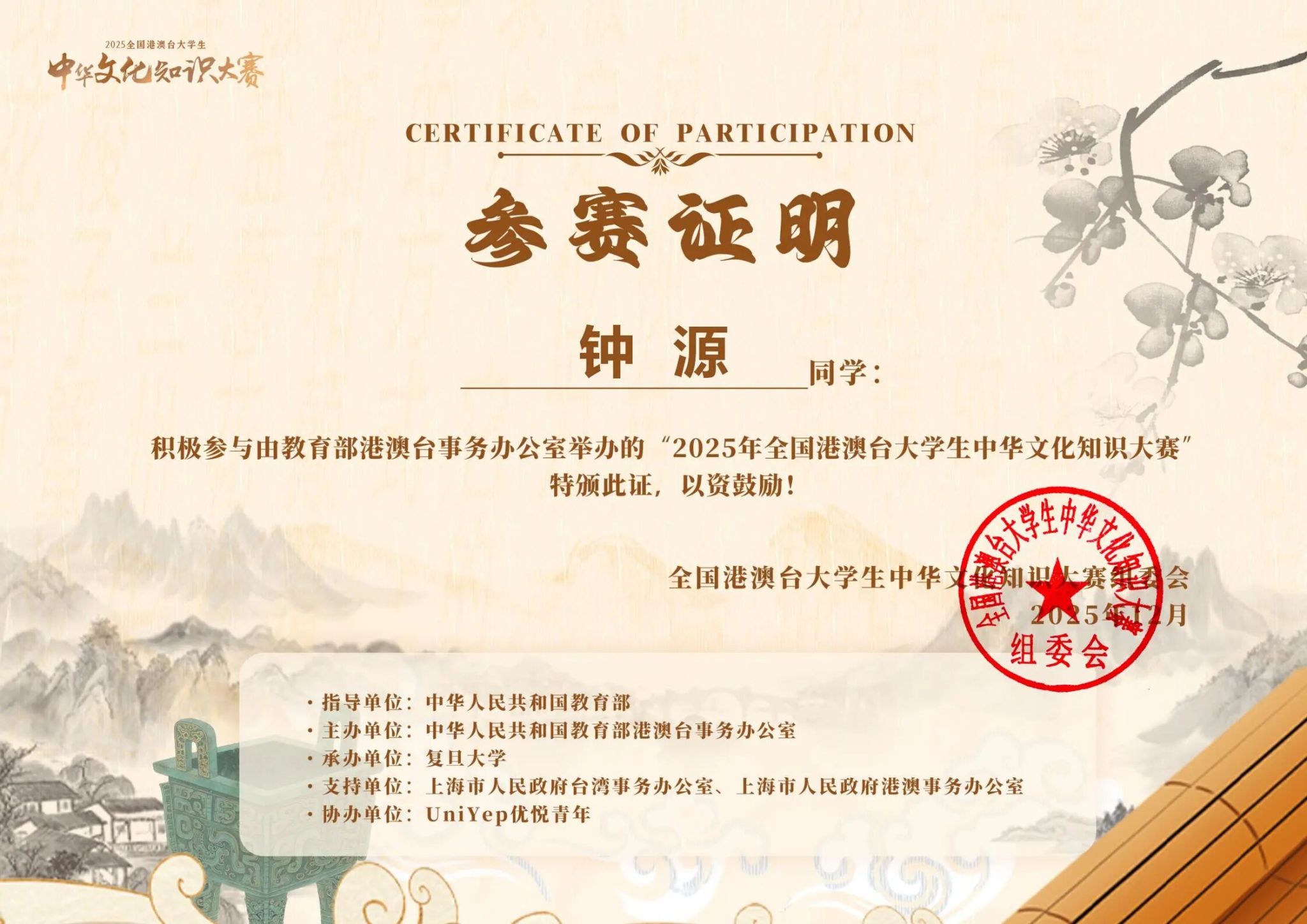 为深入弘扬中华传统文化,不断增强港澳台学生的国家认同感,历史责任感和文化归属感,教育部港澳台办拟举办2025年内地(大陆)高校港澳台学生中华文化知识大赛,吸引全国教育系统人员及师生踊跃参与。在此次活动中,我校学子踊跃报名、积极备赛,以饱满的热情参与赛事比拼,在赛场中展现了对中华文化的学习热忱与探索精神。