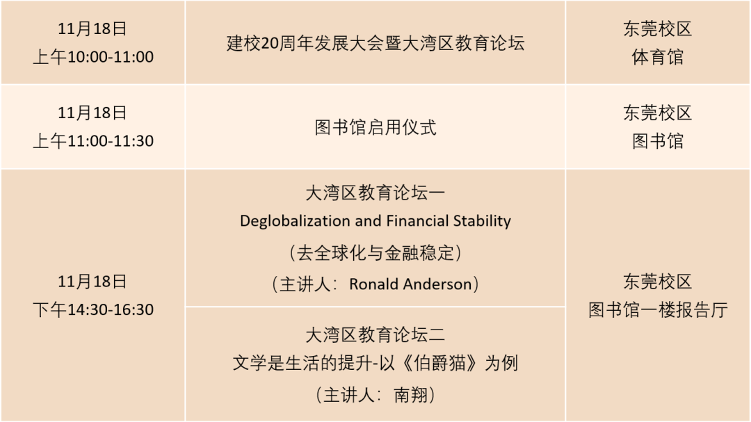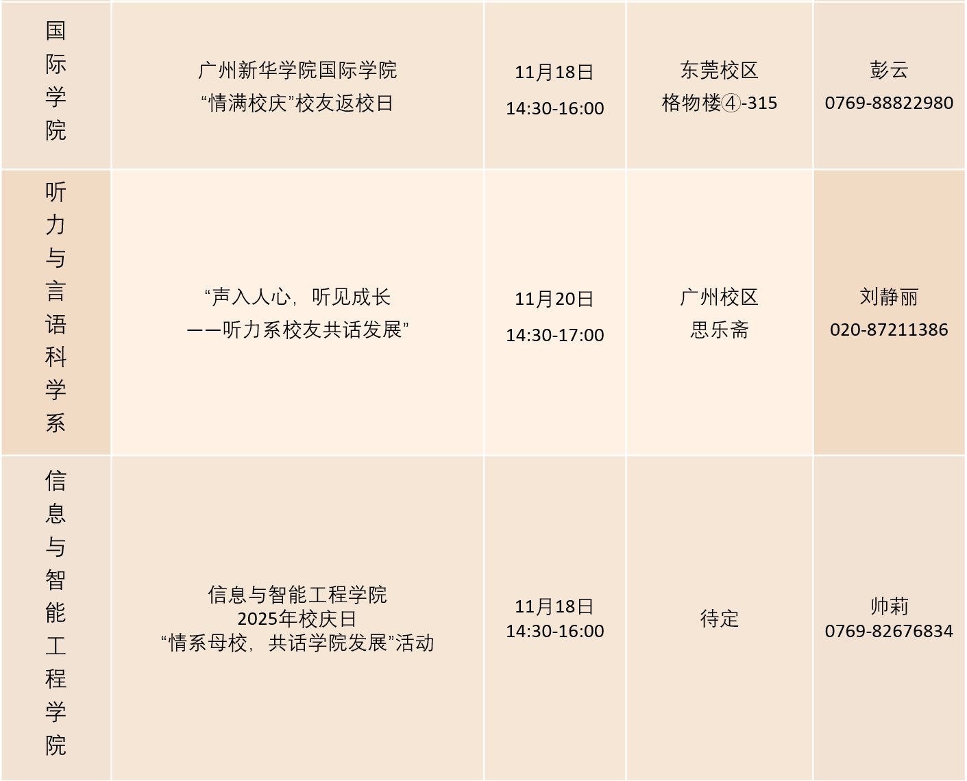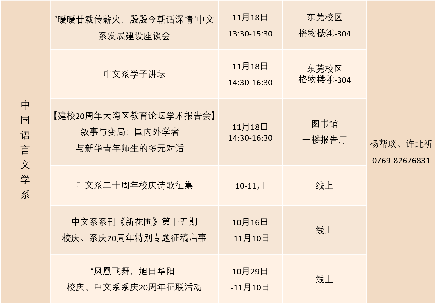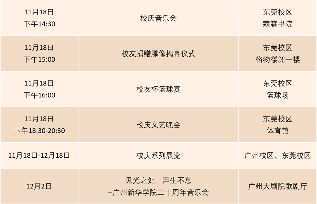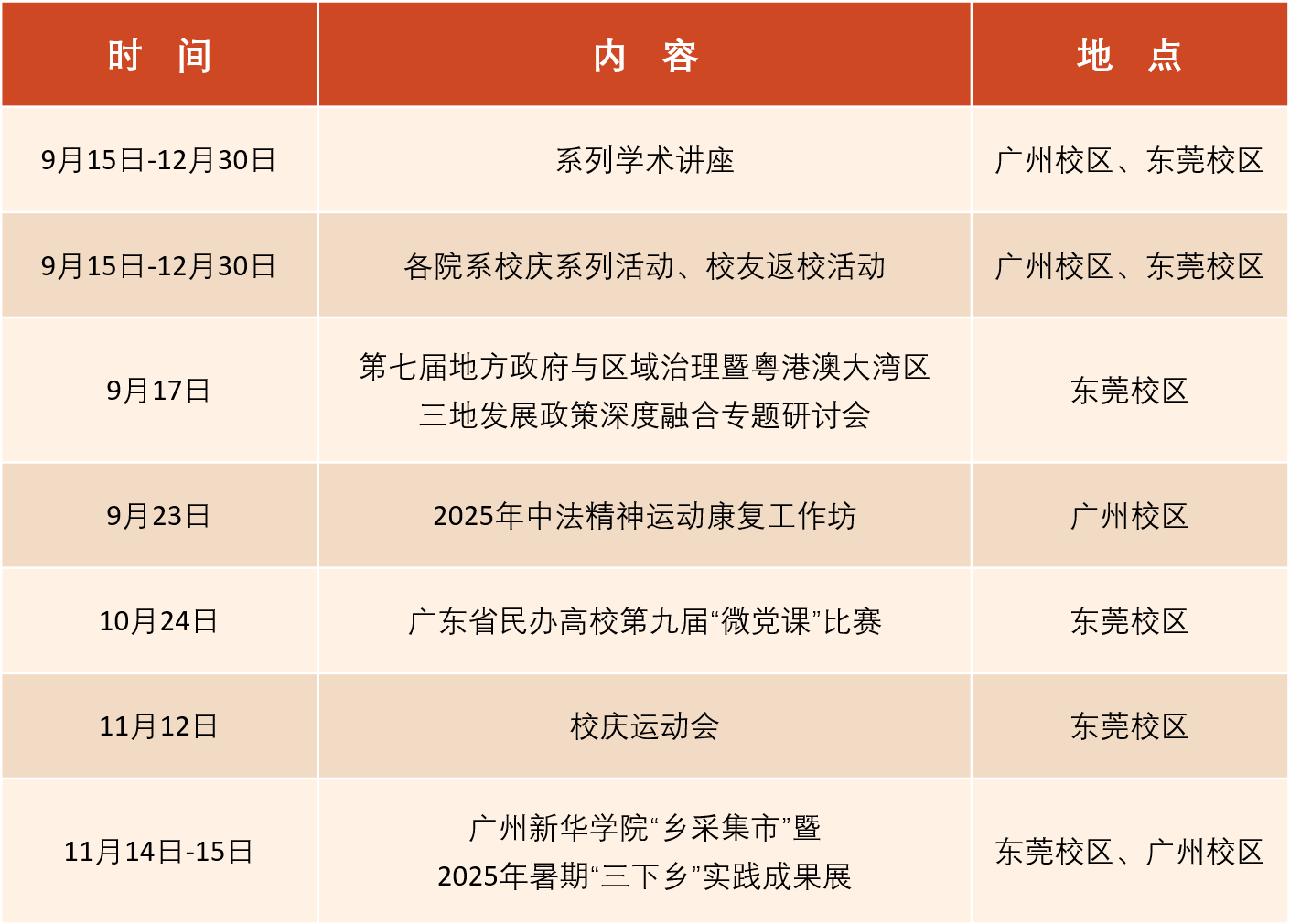 为迎接建校二十周年这一重要时刻,学校以 “凤凰飞舞,旭日华阳” 为主题,定于2025年11月18日在东莞校区隆重举行建校20周年发展大会暨大湾区教育论坛和新图书馆启用仪式,并于校庆日前后举办系列学生文化活动(具体安排详见附表)。我们诚挚邀请海内外校友、各界贤达拨冗莅临,相聚新华校园,共忆青春岁月,见证发展新篇,同绘未来宏图。