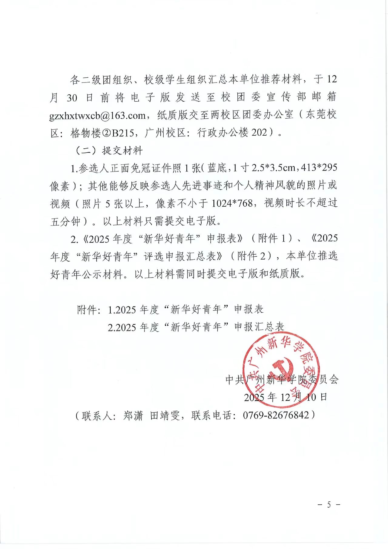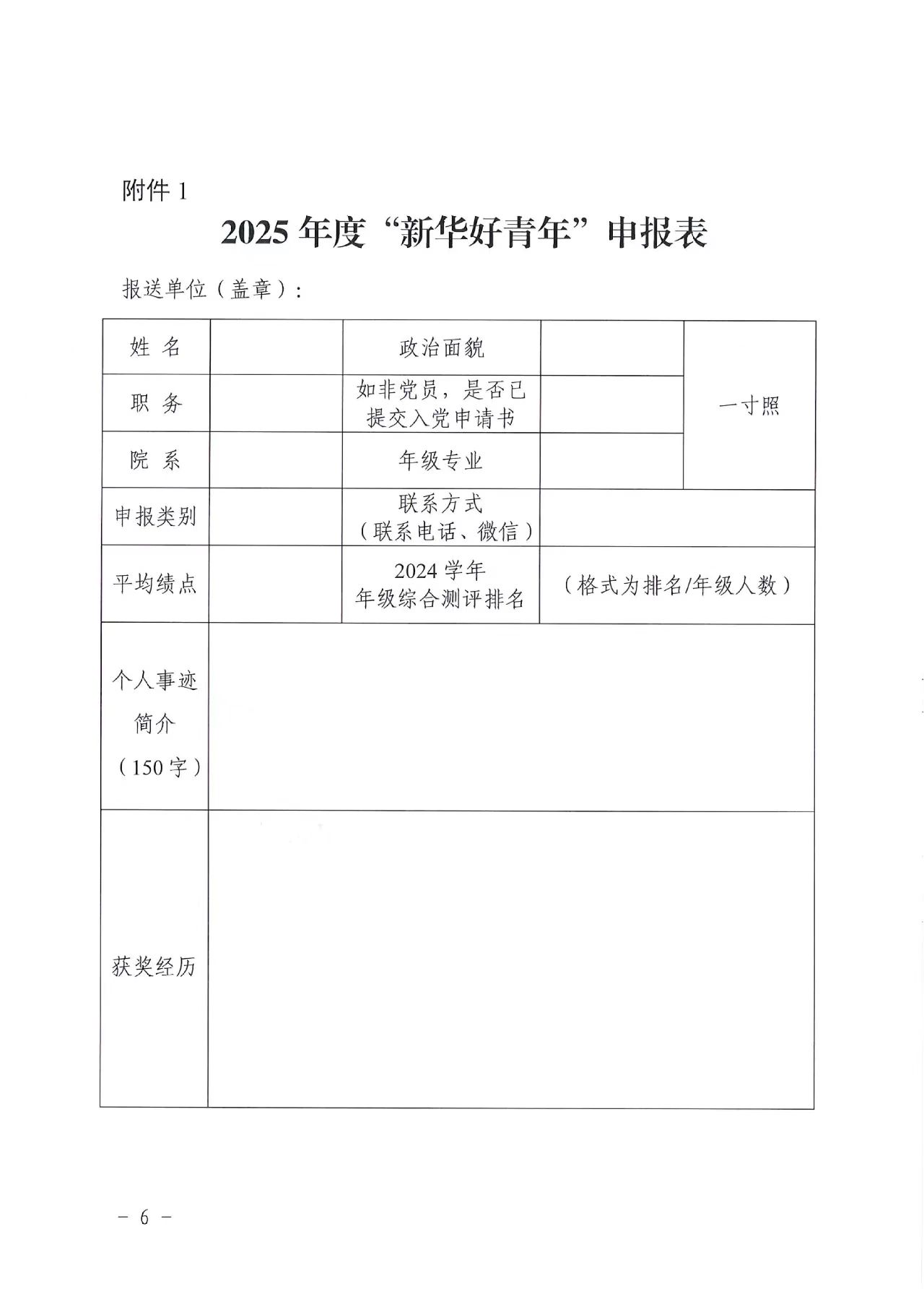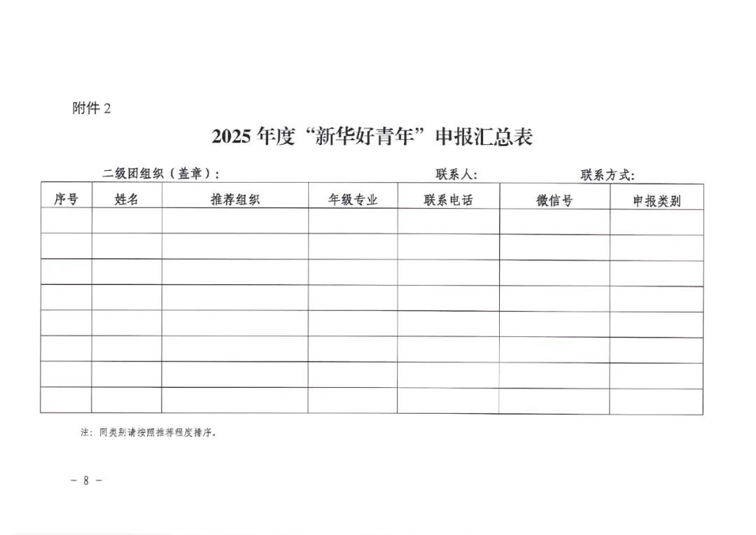 2.《2025年度“新华好青年”申报表》(附件1)、《2025年度“新华好青年”评选申报汇总表》(附件2),本单位推选好青年公示材料。以上材料需同时提交电子版和纸质版。