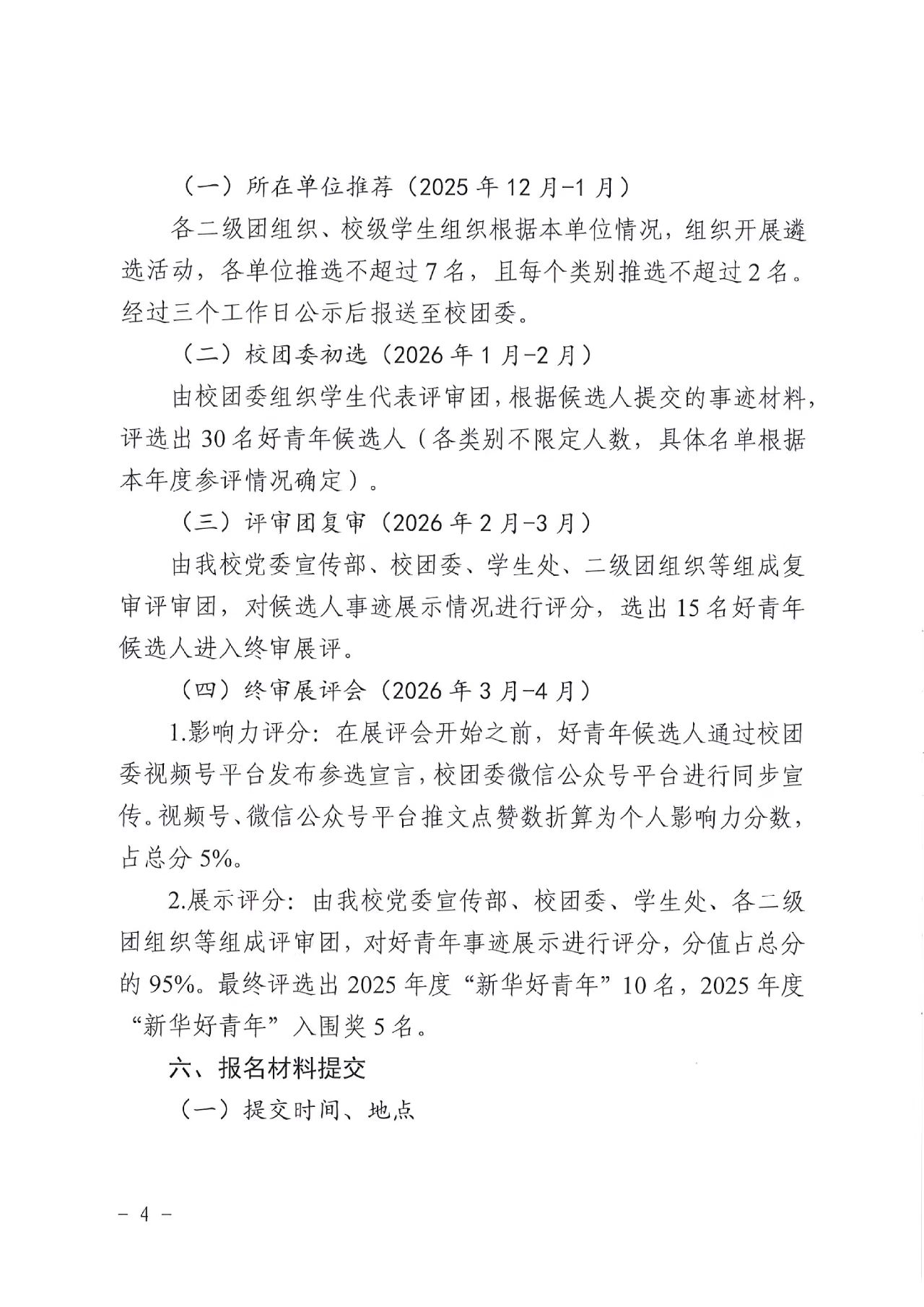 2.展示评分:由我校党委宣传部、校团委、学生处、各二级团组织等组成评审团,对好青年事迹展示进行评分,分值占总分的95%。最终评选出2025年度“新华好青年”10名,2025年度“新华好青年”入围奖5名。