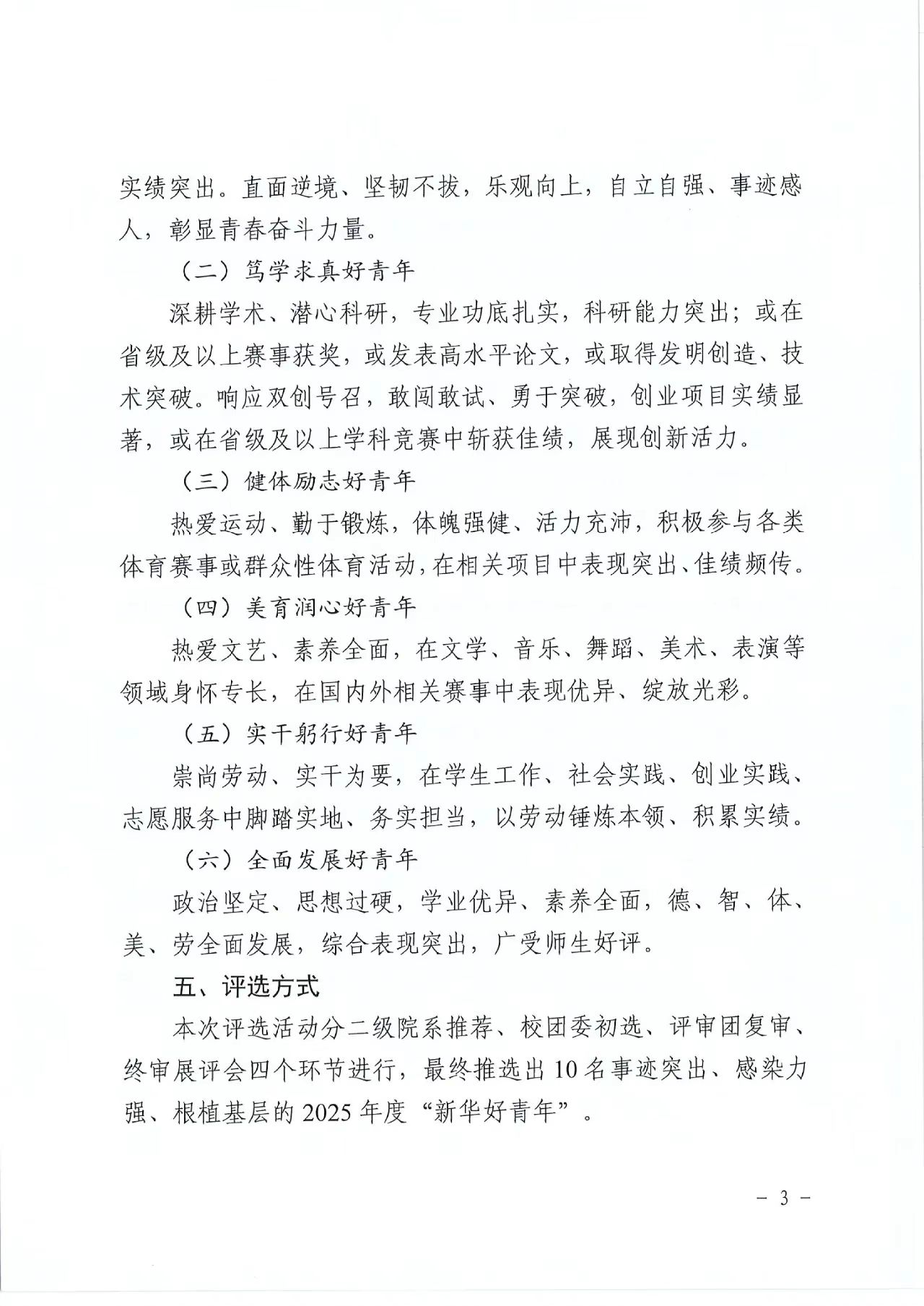 为深入学习贯彻习近平新时代中国特色社会主义思想,展示我校学生昂扬向上的精神风貌,通过选取树立新时代大学生可亲、可敬、可信、可学的身边榜样,发挥先进典型的示范引领作用,团结带领广大青年踔厉奋发、勇毅前行,决定开展2025年度“新华好青年”评选活动,现将有关事宜通知如下: