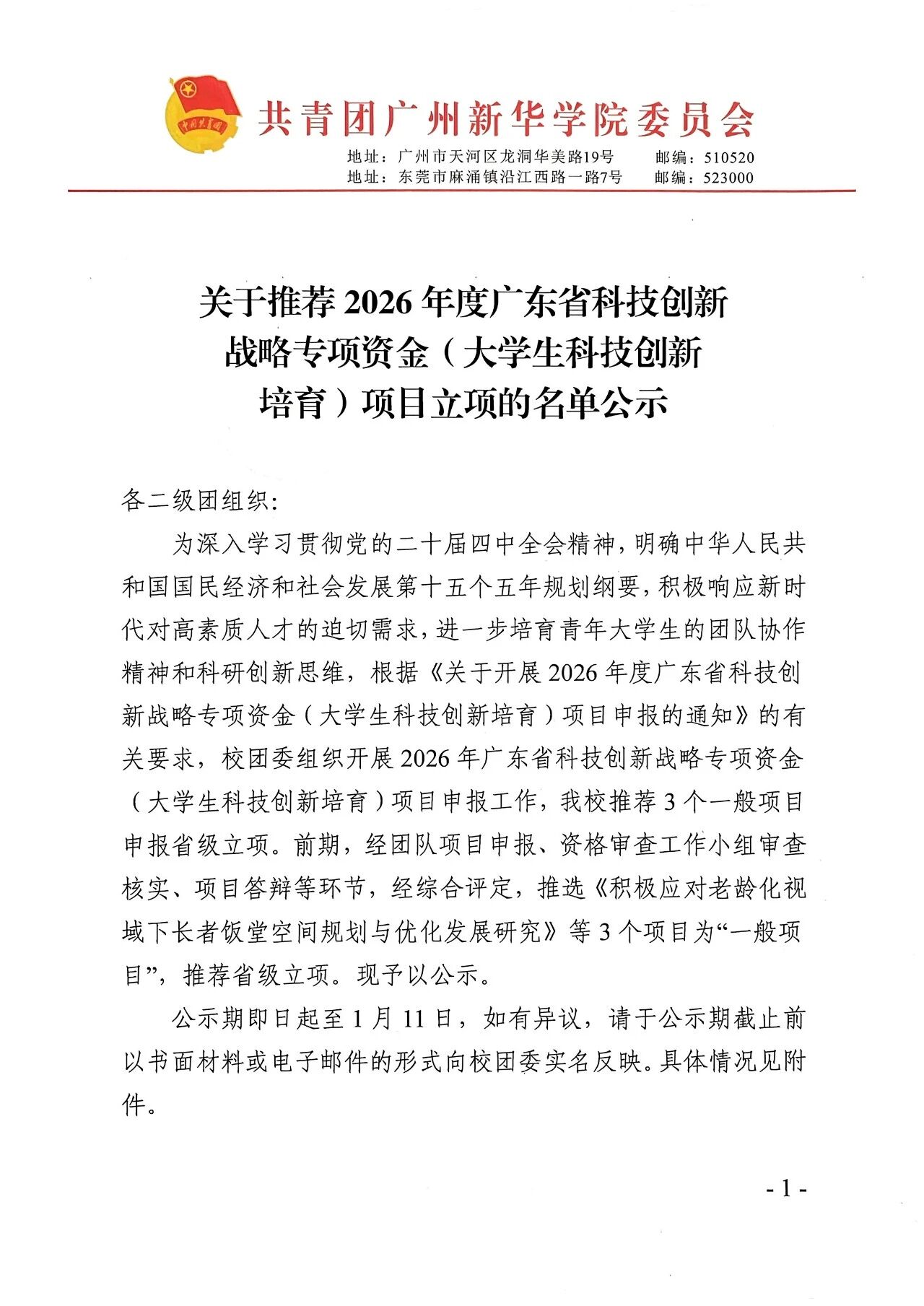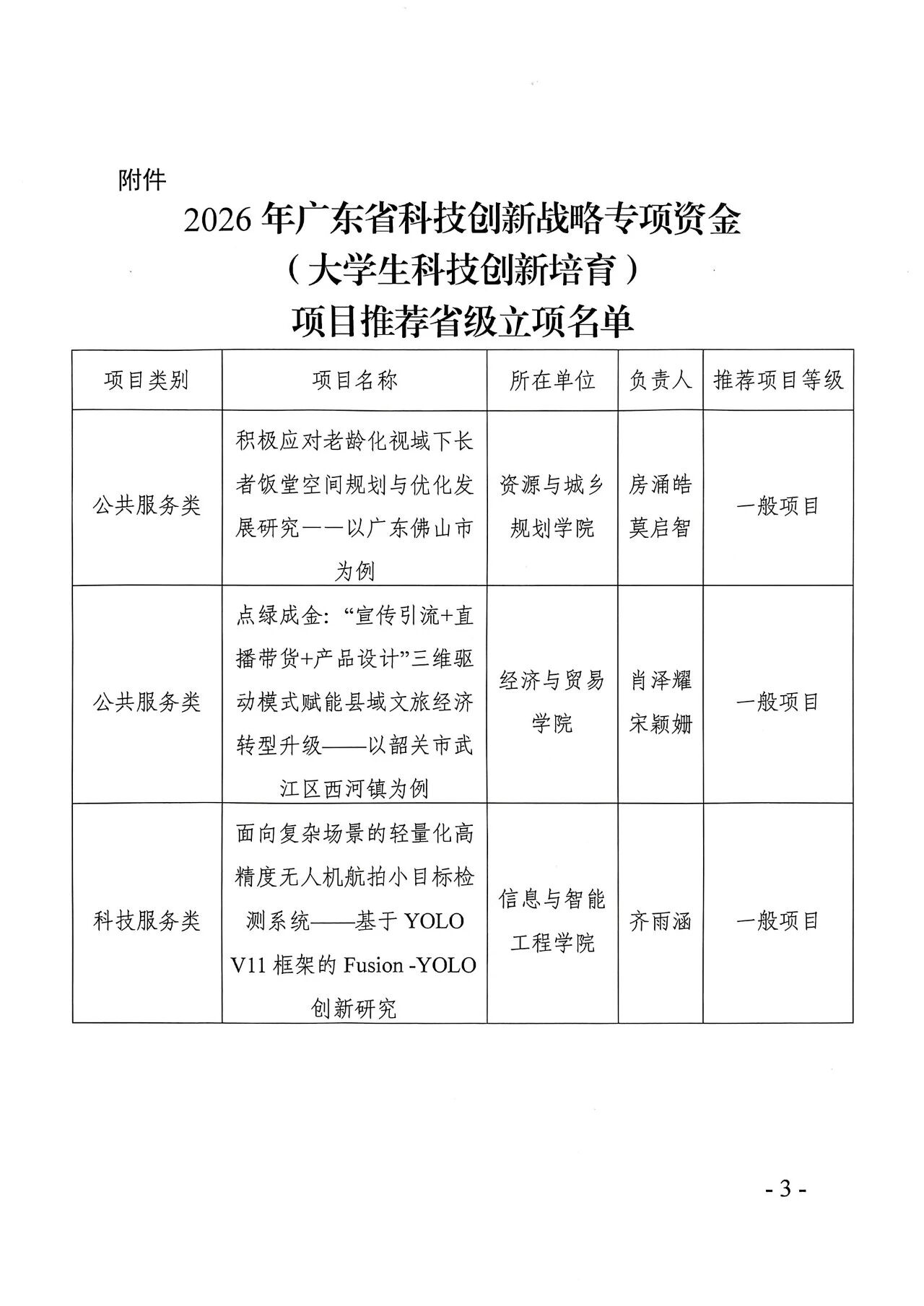 为深入学习贯彻党的二十届四中全会精神,明确中华人民共和国国民经济和社会发展第十五个五年规划纲要,积极响应新时代对高素质人才的迫切需求,进一步培育青年大学生的团队协作精神和科研创新思维,根据《关于开展2026年度广东省科技创新战略专项资金(大学生科技创新培育)项目申报的通知》的有关要求,校团委组织开展2026年广东省科技创新战略专项资金(大学生科技创新培育)项目申报工作,我校推荐3个一般项目申报省级立项。前期,经团队项目申报、资格审查工作小组审查核实、项目答辩等环节,经综合评定,推选《积极应对老龄化视域下长者饭堂空间规划与优化发展研究》等3个项目为“一般项目”,推荐省级立项。现予以公示。