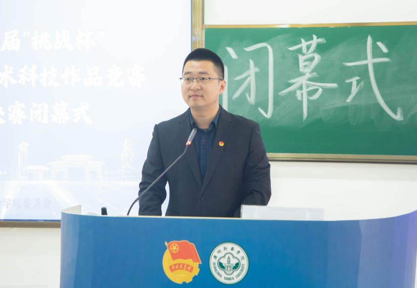 在闭幕式即将结束之际,李毅副校长为本次答辩会总结讲话。他向各位师生提出以下三点期望,一是坚持三全育人的理念,持续推进科技实践育人工作;二是聚焦双创实践,全面提升科创项目的质量;三是积极发挥挑战杯的示范作用。最后,他对本次获奖的团队给予祝贺,并衷心祝愿各参赛团队能在省赛中再创佳绩,为校争光。