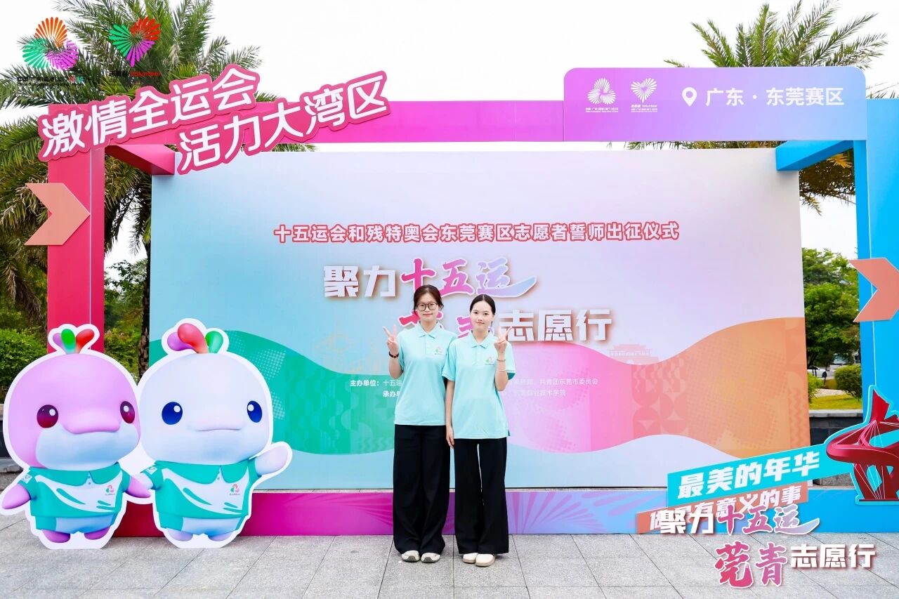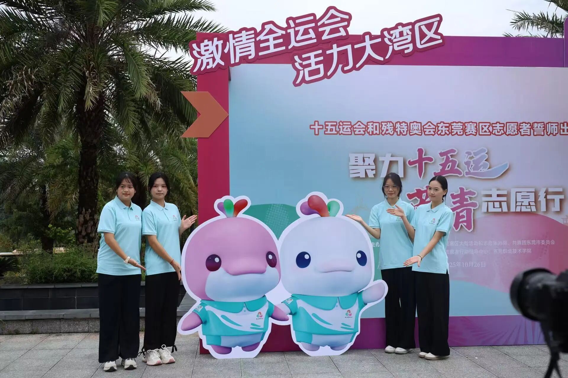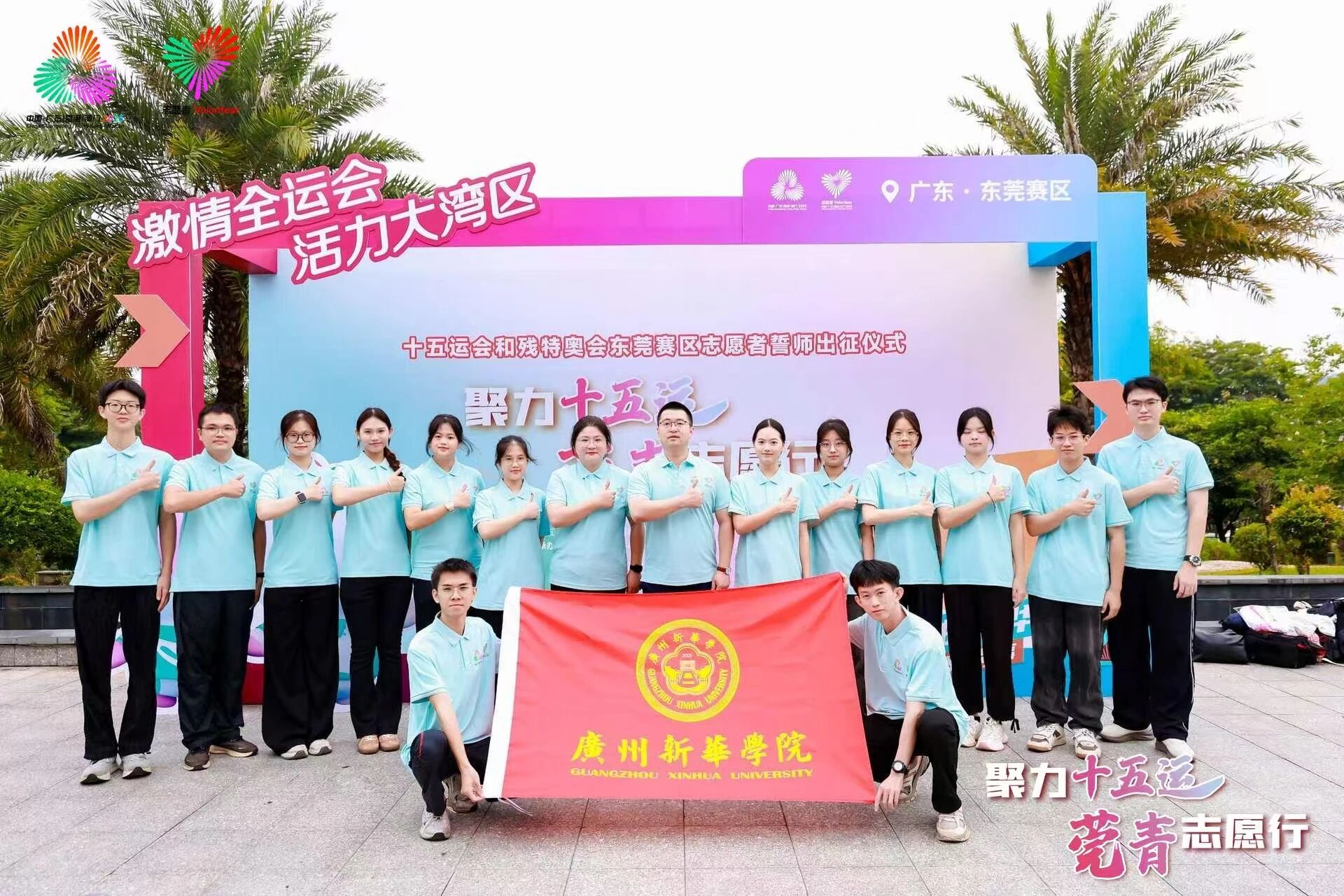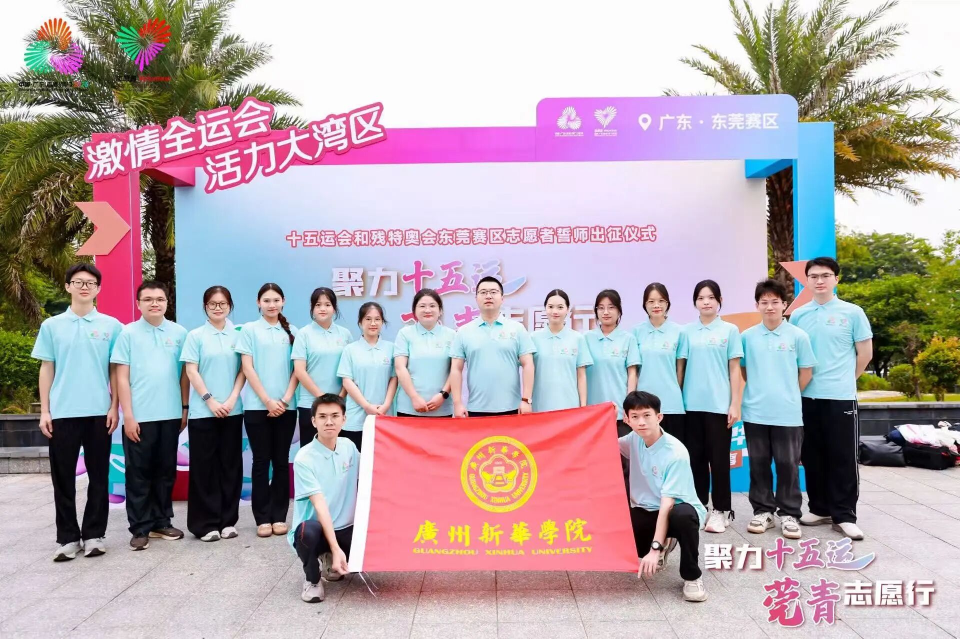 青春与盛会同频,志愿与城市共振。为迎接第十五届全国运动会和第十二届残疾人运动会暨第九届特殊奥林匹克运动会(以下简称“十五运会和残特奥会”),展现东莞青年志愿者的风采与担当,十五运会和残特奥会东莞赛区志愿者誓师出征仪式暨“聚力十五运·莞青志愿行”青年交友团建活动于10月26日在给东莞职业技术学院松山湖校区隆重举行。广州新华学院(东莞校区)的志愿者满怀激情,共同奔赴这场青春之约!