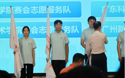 志愿者代表上台授旗(左一为广州新华学院志愿者代表)