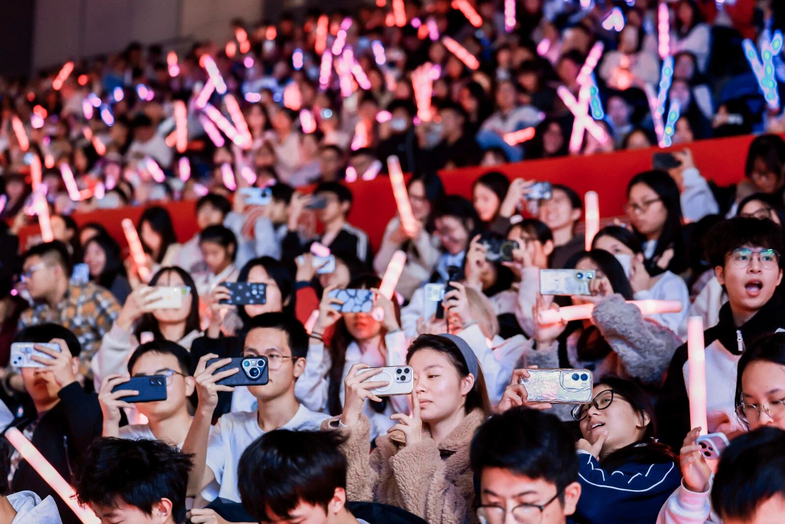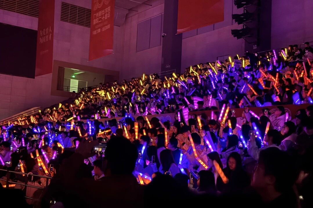 节目开始后,观众席上,荧光棒随旋律流转成流动的星河,黄紫交织的光影与跃动的节奏交织出梦幻画卷。前排师生手持应援棒组成光浪,后排观众自发亮起手机闪光灯点缀星点,此起彼伏的喝彩声如春风拂过场馆,将热烈氛围晕染至每个角落。当节目进入高潮,雷鸣般的掌声自四面八方涌向舞台,为每个惊艳瞬间加冕、为每位演绎者喝彩,声浪层层叠叠撞向穹顶,将广州新华学院二十年校庆的喜悦推向沸腾的顶点。