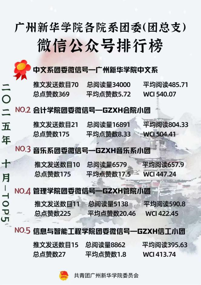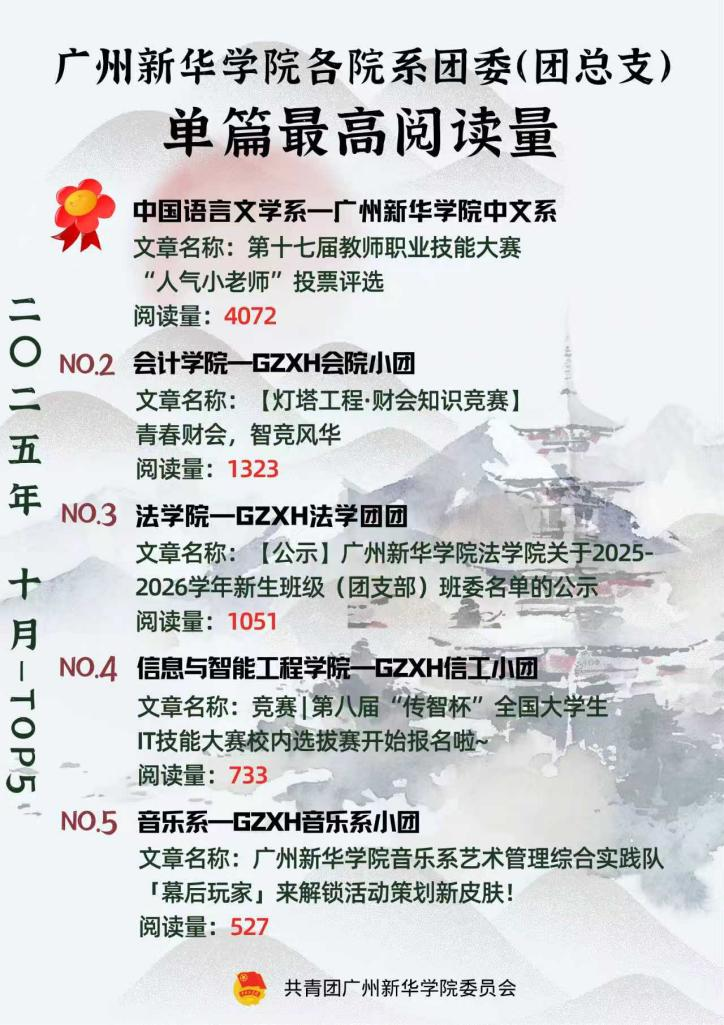 广州新华学院各院系团组织单篇最高阅读量排行榜