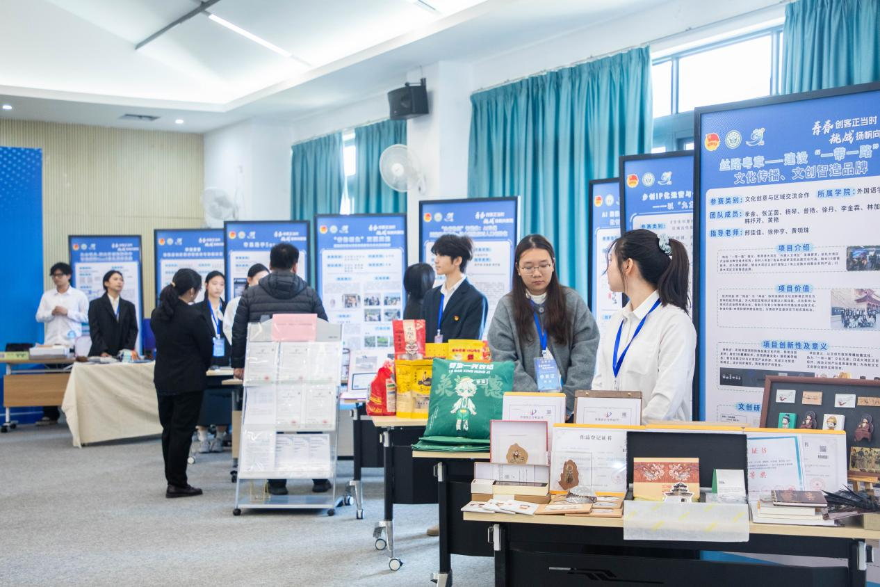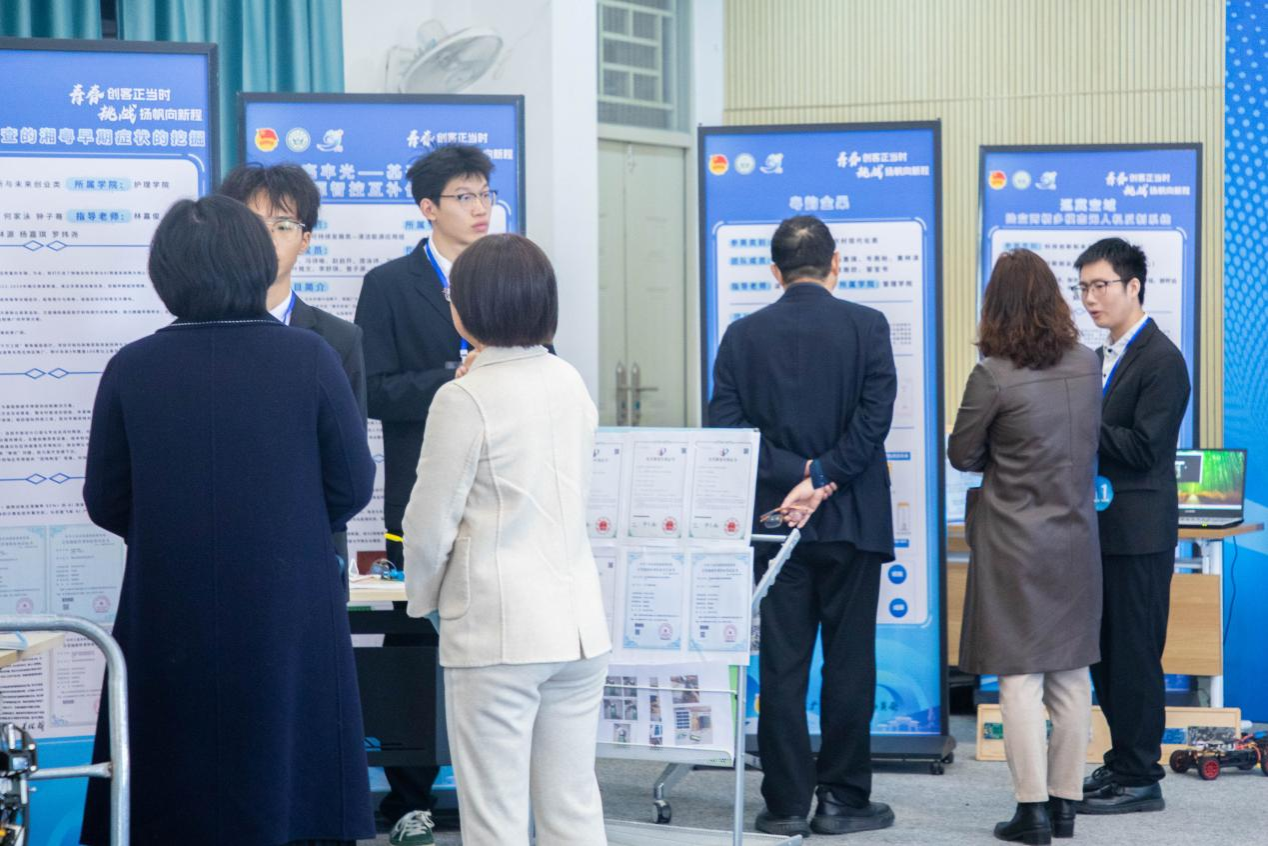 学校领导与专家评委前往参赛项目展示区参观团队的相关成果。参赛代表向专家评委们系统介绍团队参赛项目与生动实践。专家评委通过多对一的质询交流,了解各团队项目创业项目的设计理念、核心技术优势与市场应用前景,并对相关项目进行评价与建议。