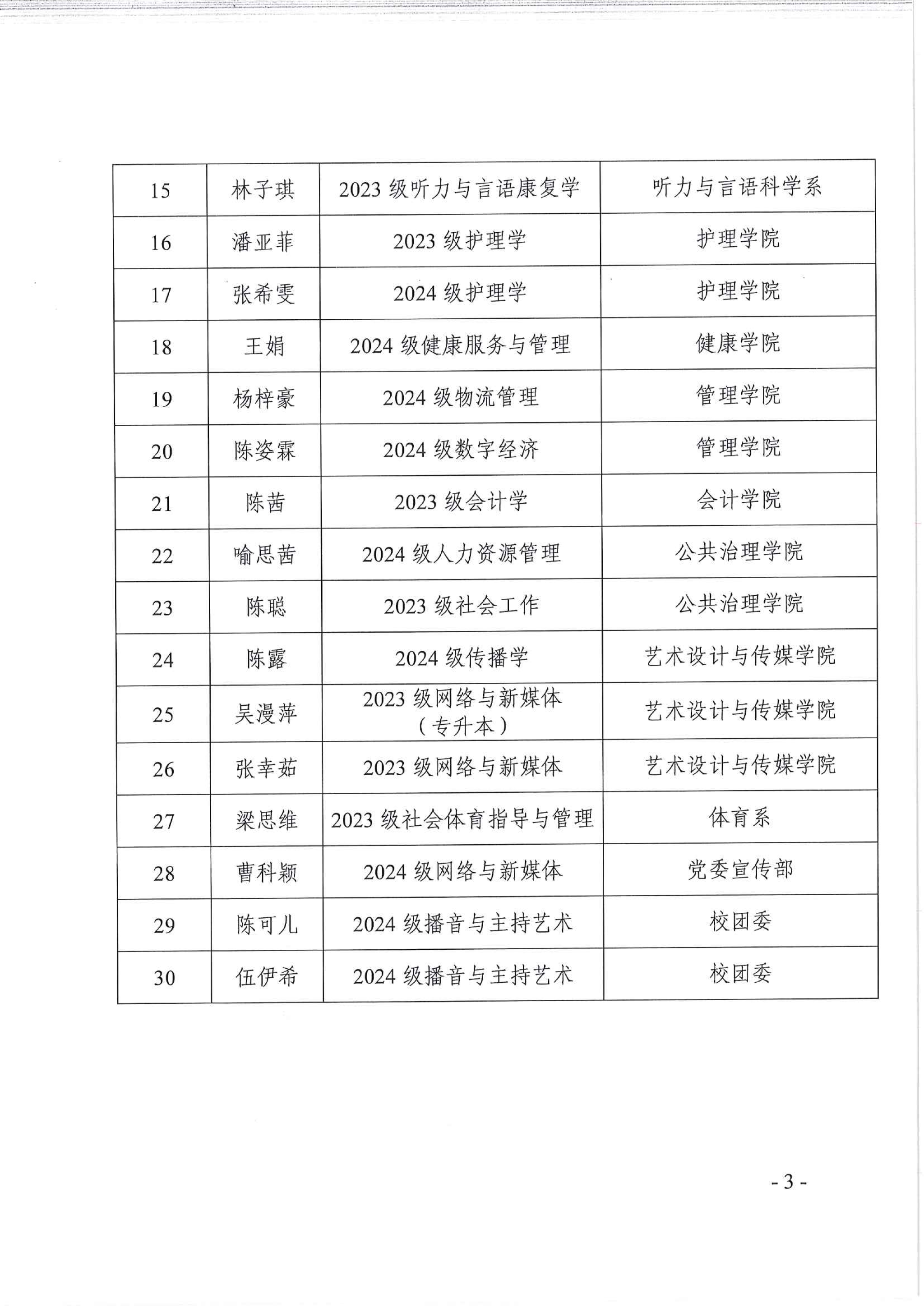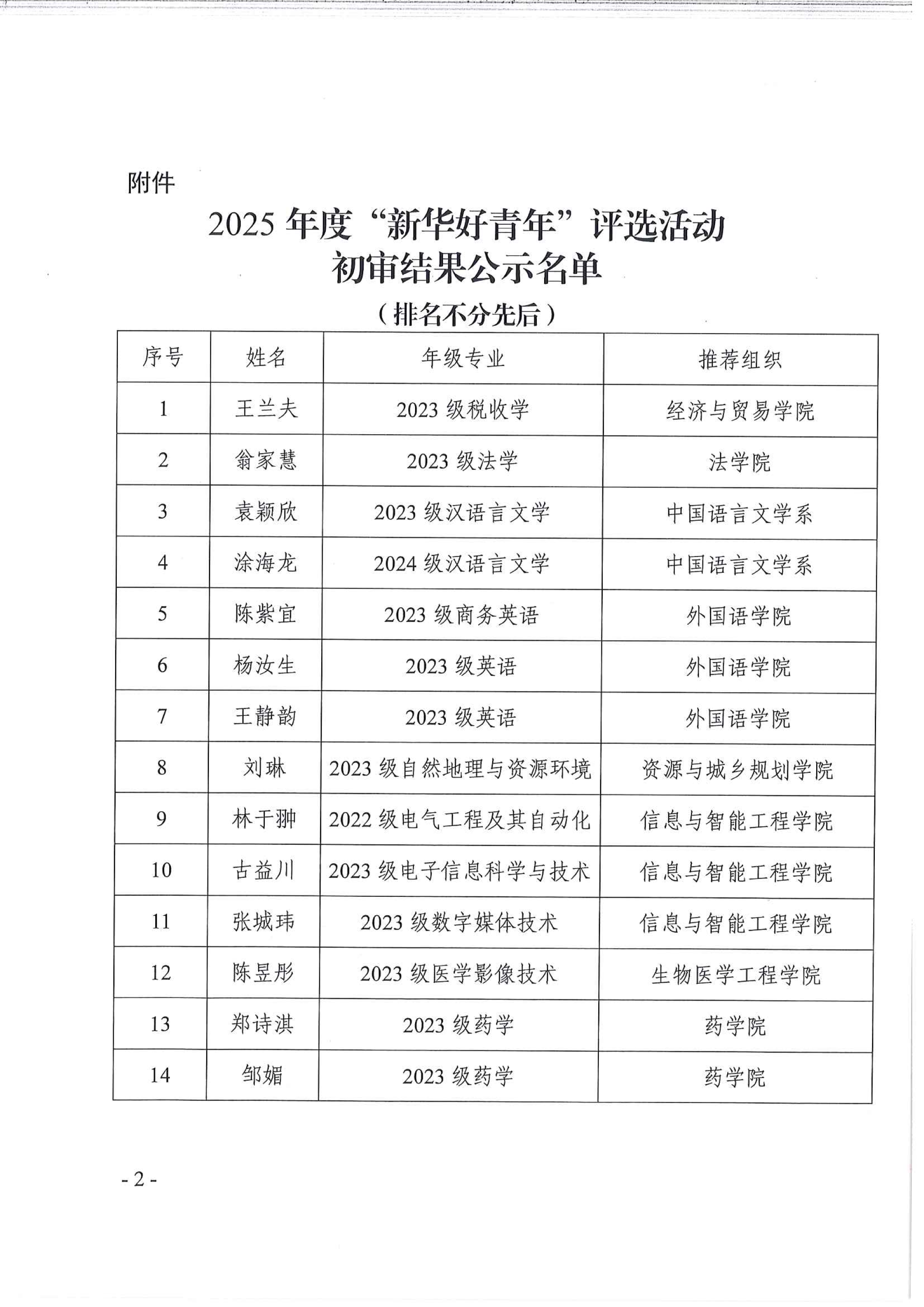 为学习贯彻党的二十大和二十届四中全会精神,激扬青春奋斗,激励青年在新时代下,总结历史经验,紧跟党的步伐,充分发挥我校优秀学子示范带动作用,引领广大青年在强国建设、民族复兴的伟业中挺膺担当,校团委开展了2025年度“新华好青年”评选活动.自活动启动以来,各学院积极响应,共有91名同学参与本次评比。经过院系初审推荐、校团委各部门及二级院系团学干部初选,共有30名同学进入2025年度“新华好青年”评选活动复审,现予以公示(名单见附件)。