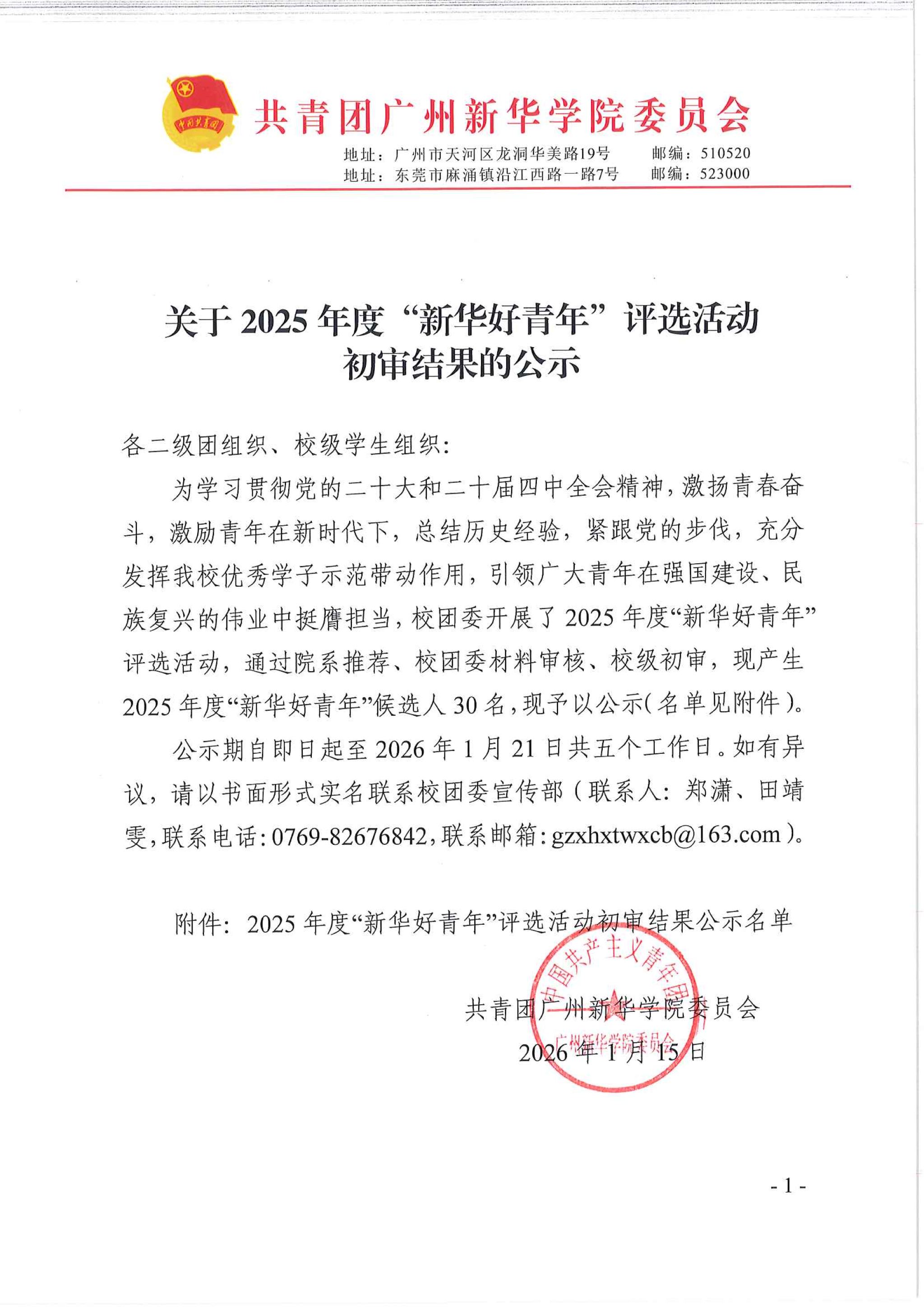 公示期自即日起至2026年1月21日共五个工作日。如有异议,请以书面形式实名联系校团委宣传部