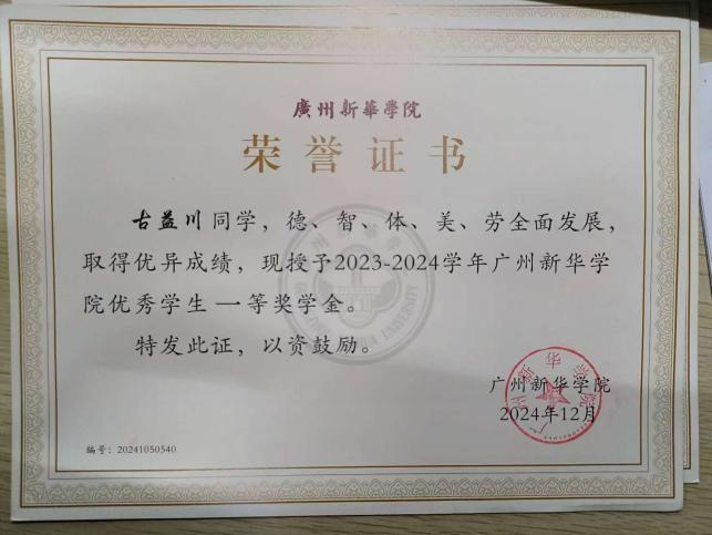 曾获得2023年广州新华学院优秀学生奖学金“校级一等奖”、2023年广州新华学院信息与智能工程学院“三好学生”、2024年广州新华学院优秀学生奖学金“校级二等奖”、2024年广州新华学院信息与智能工程学院“三好学生”、2024年广州新华学院企业及个人捐助奖学金、2025年第七届全球校园人工智能算法精英大赛总决赛 算法应用赛 无人视觉巡航赛二等奖、2025年全国信息通信技术大赛--第九届全国大学生网络与信息技术赛项全国总决赛“数字化场景设计与开发赛道”本科组三等奖、2024年全国信息通信技术大赛--第八届全国大学生网络与信息技术赛项分区赛“5G网络工程实践赛道”本科组三等奖、2025年第十一届全国青年科普创新实验暨作品大赛广东选拔赛创意作品项目人机协作(大学组)二等奖、2025年iCAN大学生创新创业大赛(大湾区赛区)二等奖、2024年“广州新华学院优秀共青团员”、2024年“广州新华学院优秀志愿者”、第十六届全国大学生数学竞赛校级 优胜奖、2023年广州新华学院信息与智能工程学院铭爱志愿队“优秀干事”、广州新华学院信息与智能工程学院2024年“红脉传承筑党魂,青衿奋进谱团章”党团知识竞赛第三名、2024年广州新华学院信息与智能工程学院优秀学生助理。