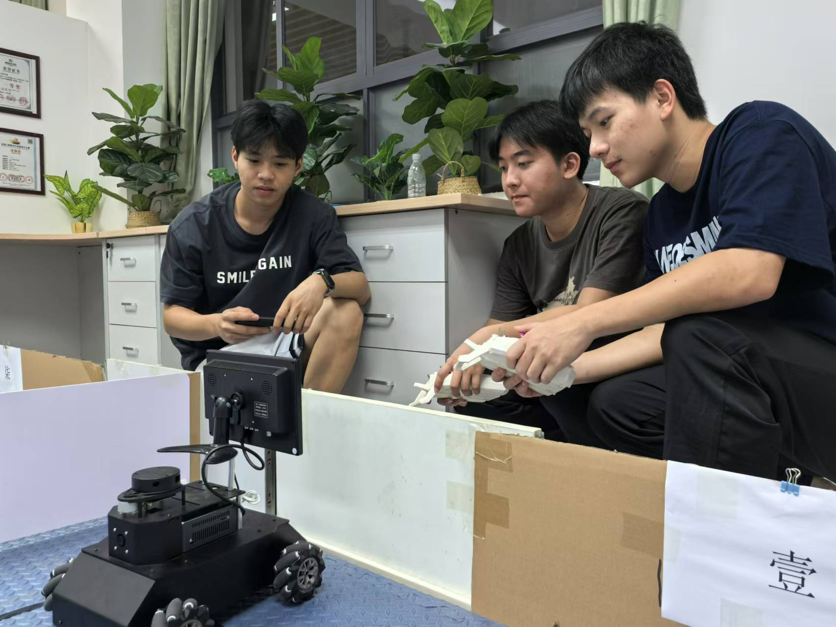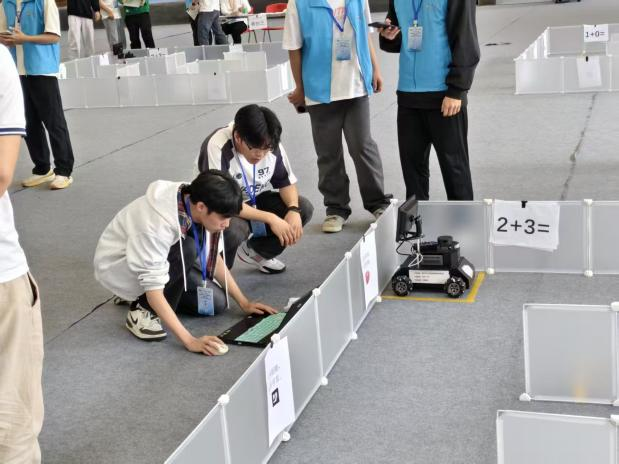 图二:古益川(左一)第二十六届中国机器人及人工智能大赛省级层次选拔赛 机器人任务挑战赛(自主巡航)广东赛区比赛现场调试设备
