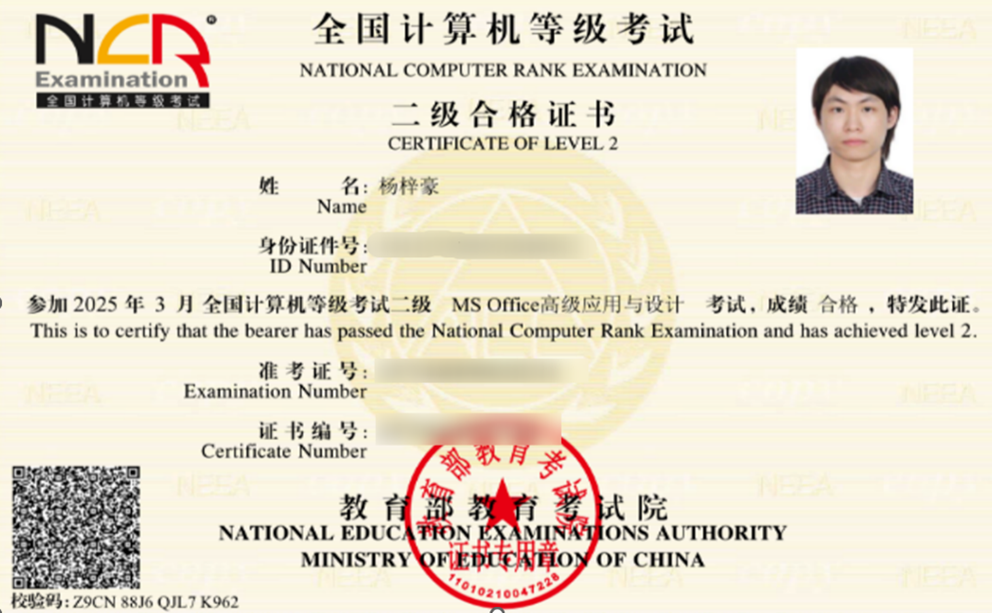 图六:杨梓豪获全国计算机等级考试二级合格证书