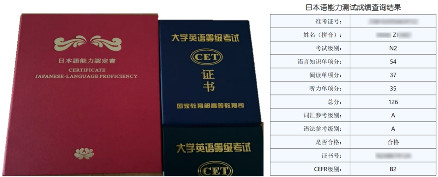 图五:杨梓豪获JLPT日语N2等级与CET英语四六级证书