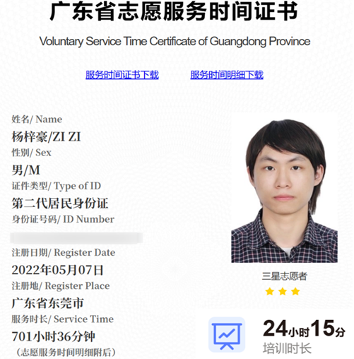 图八:杨梓豪的广东I志愿服务时间与培训时长证书