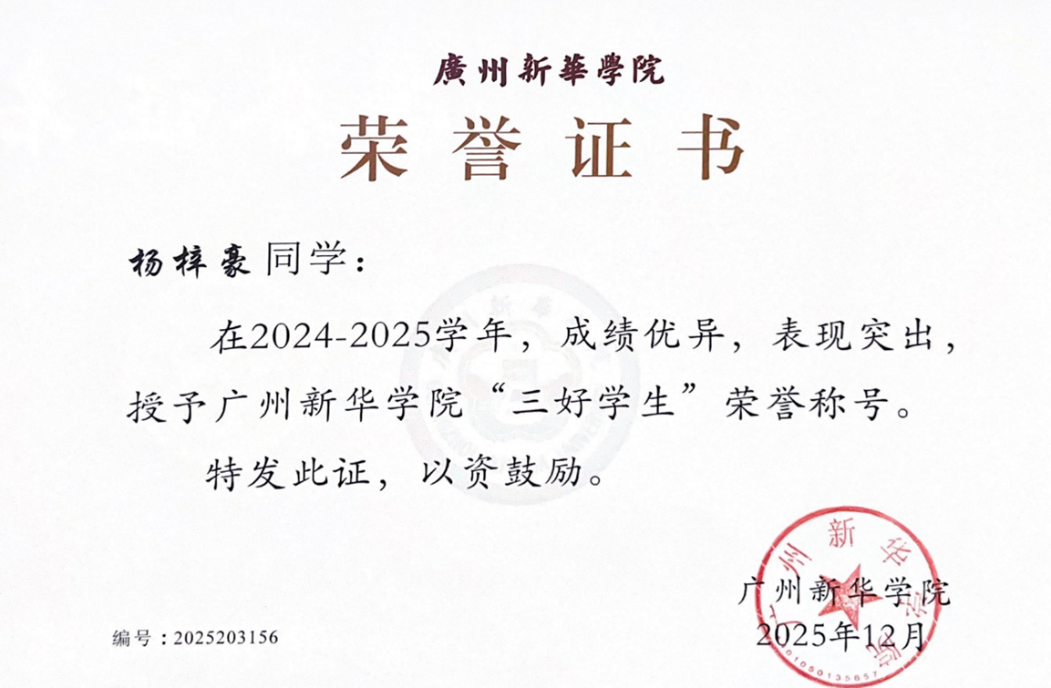 图四:杨梓豪获校“三好学生”荣誉证书