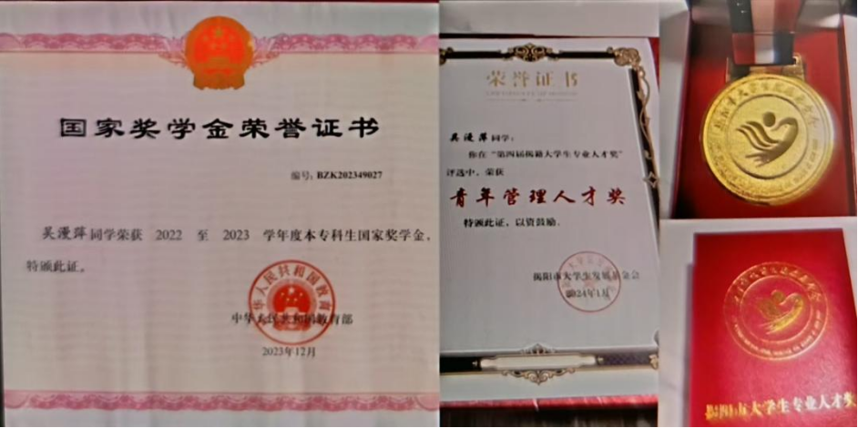 图四:吴漫萍荣获国家奖学金、揭阳市青年管理人才奖证书及奖牌