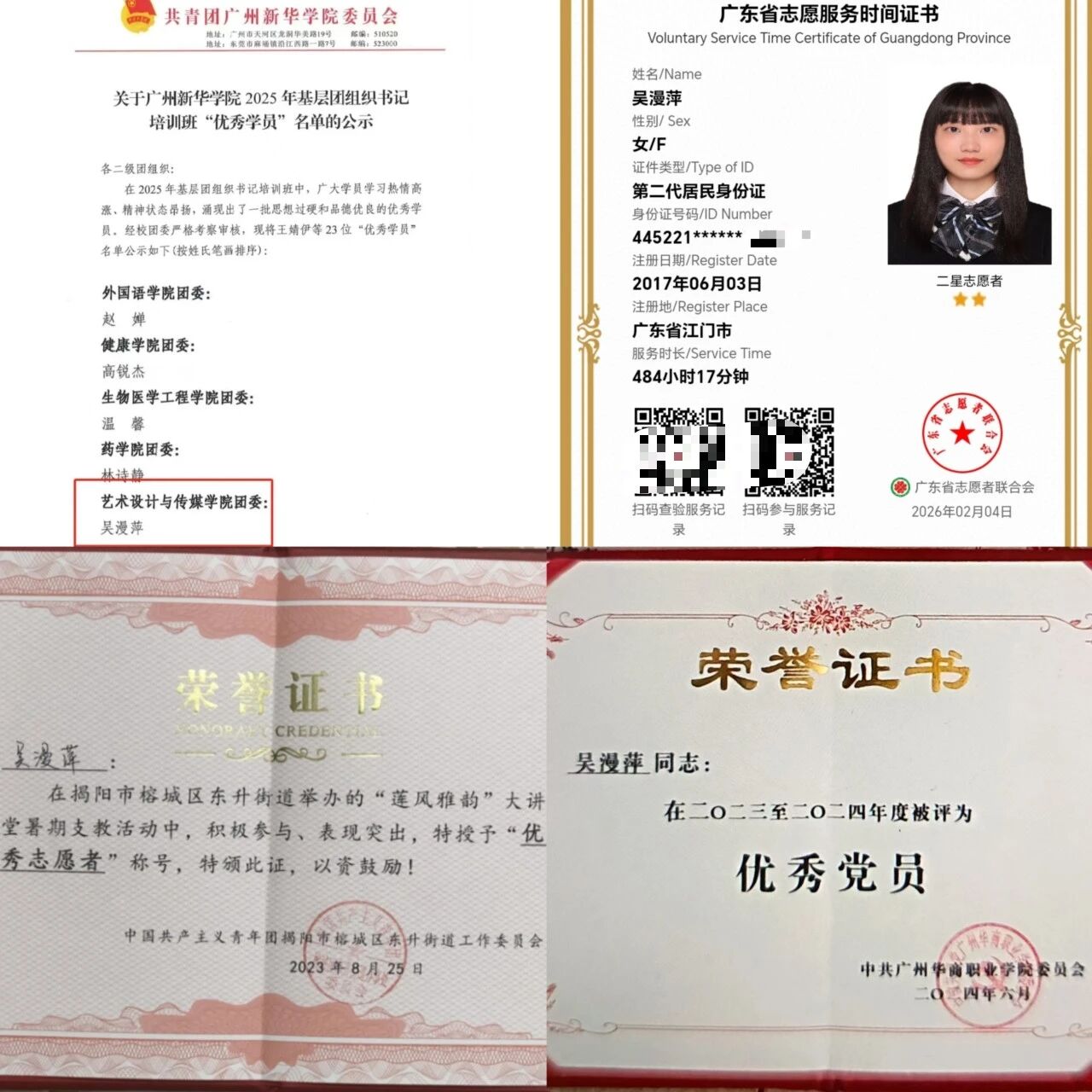 图二:吴漫萍荣获广州新华学院2025年基层团组织书记培训班“优秀学员”称号、荣获揭阳市榕城区“优秀志愿者”称号、“优秀党员”称号、志愿服务时长证书