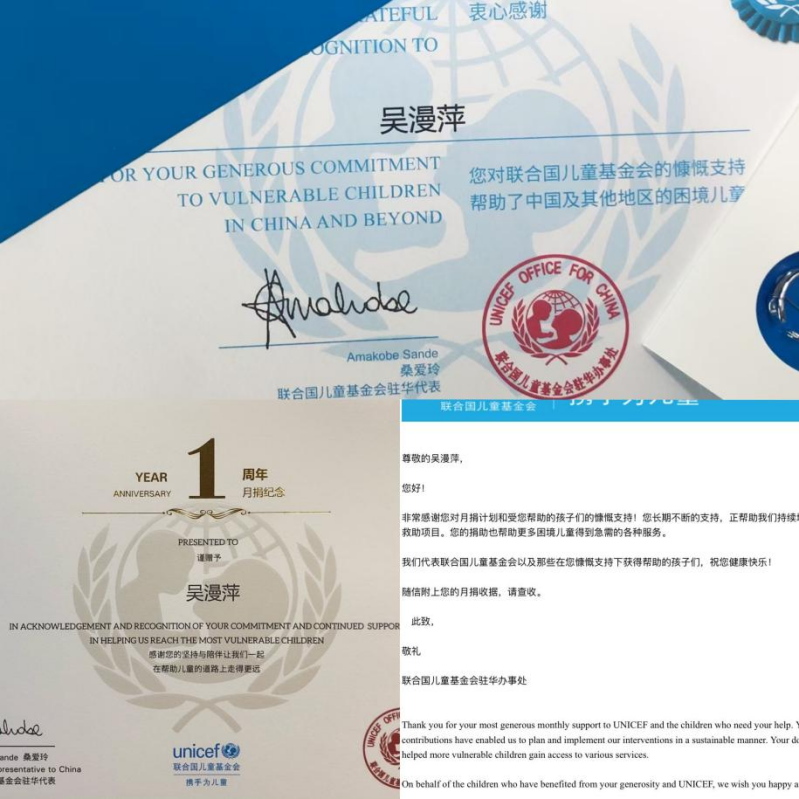 图三:吴漫萍荣获联合国儿童基金会1周年月捐纪念证书