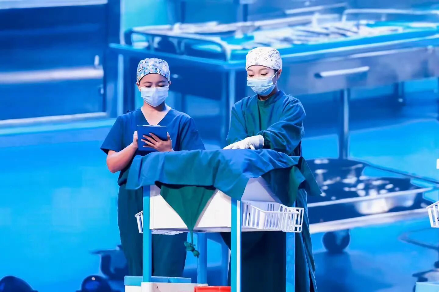 图六:潘亚菲(右一)参与广州新华学院20周年校庆节目《白衣芳华,薪火相传》表演现场
