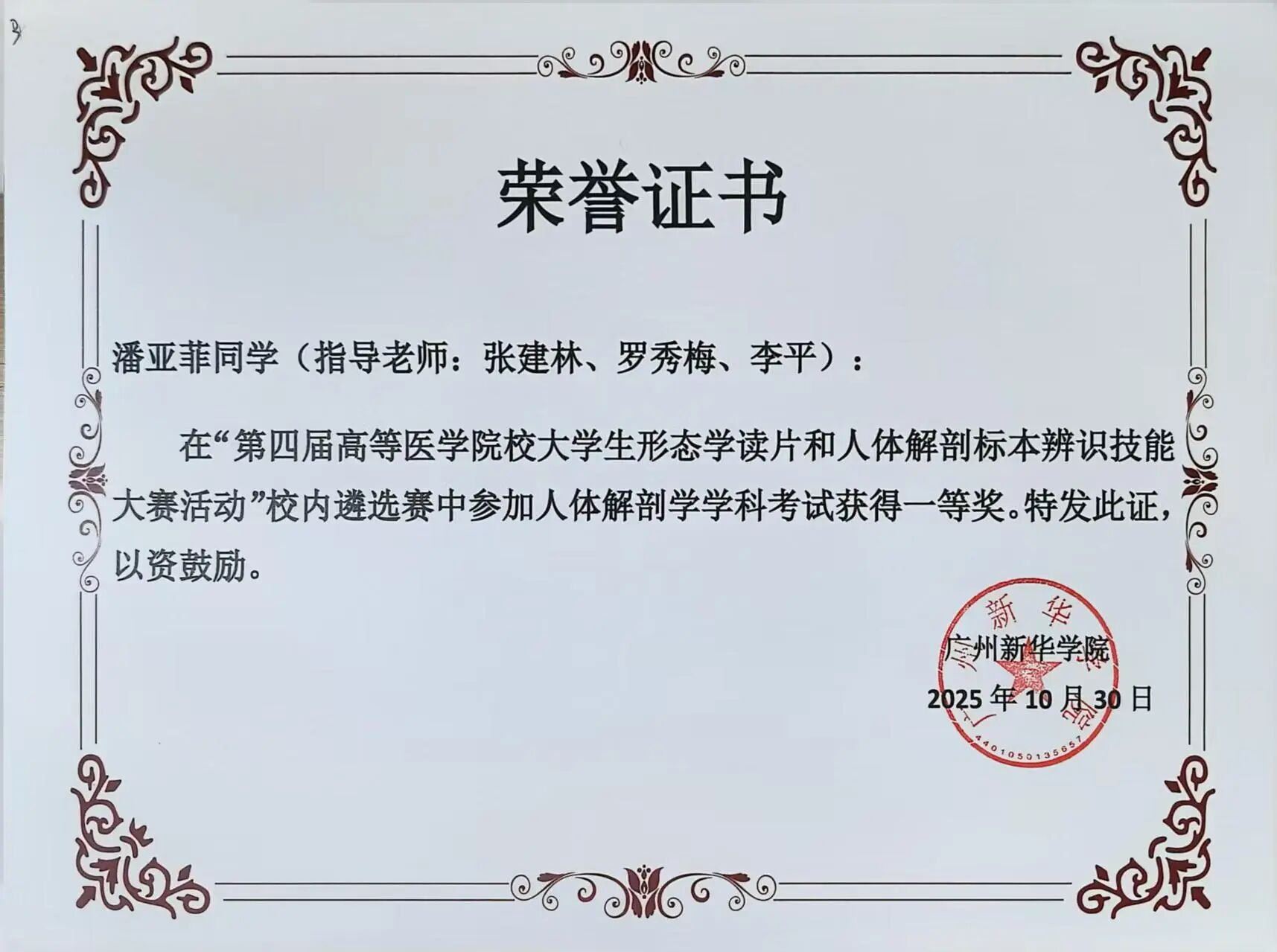 图五:潘亚菲获第四届高等医学院校大学生形态学读片和人体解剖标本辨识技能大赛一等奖