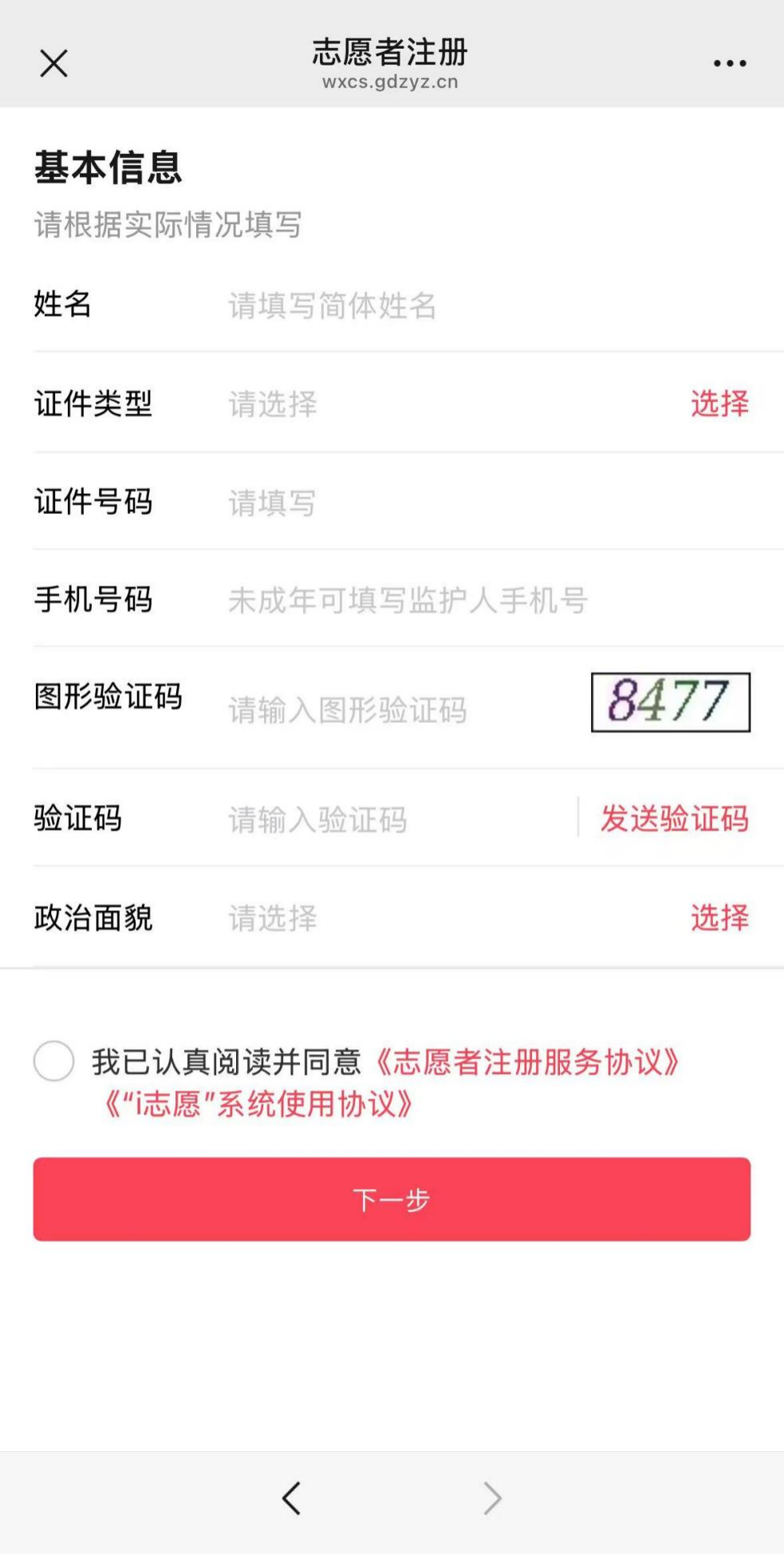 4.根据要求填写基础信息、志愿服务信息、个人简历及其他资料,填写完毕后点击“下一步”,系统将自动保存填写信息。