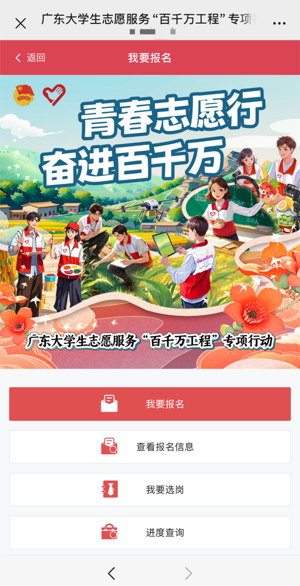 注意:报名广东大学生志愿服务“百千万工程”专项行动志愿者请同步在“大学生志愿服务西部计划”官网(http://xibu.youth.cn)中填报相关信息。